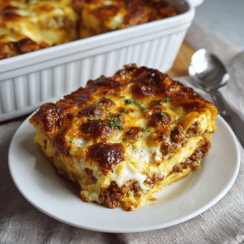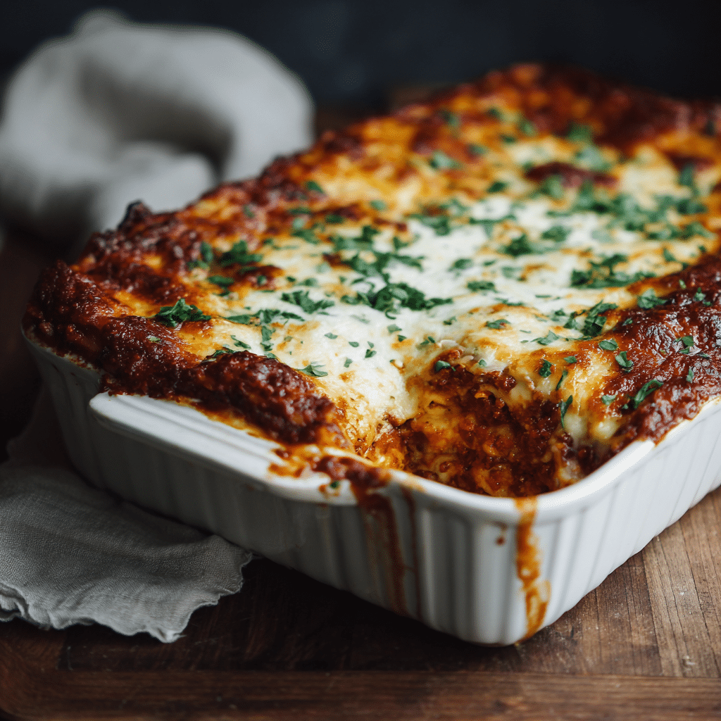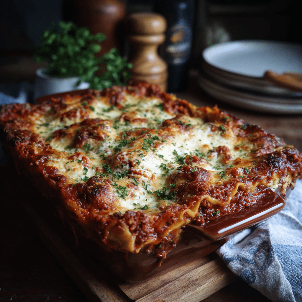 I cook onion, garlic, ground beef, and sausage, then simmer with tomatoes and herbs. I boil lasagna noodles until al dente. I mix ricotta, egg, parmesan, and parsley. I layer sauce, noodles, ricotta, and mozzarella in a baking dish. I repeat layers and finish with cheese on top. I bake covered at 180°C for 25 minutes, uncover, and bake 20 more minutes until golden and bubbly. I rest it before slicing. This Baked Lasagna Recipe tastes rich, comforting, and perfect for family dinners and special gatherings.