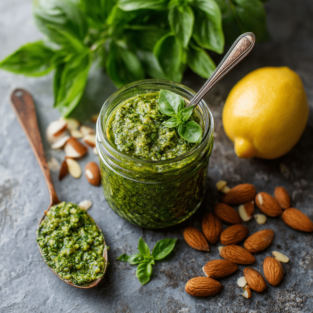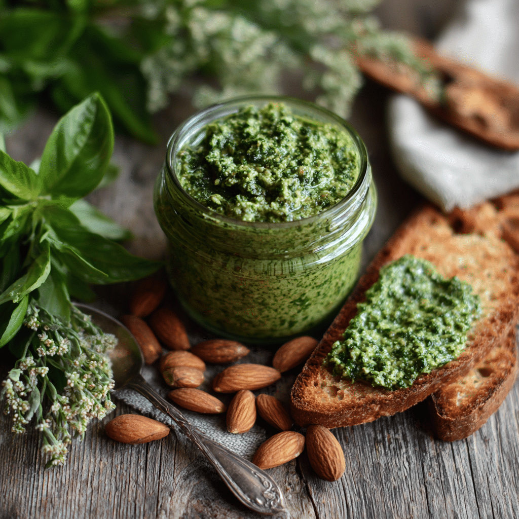 Traditional pesto uses pine nuts, but one afternoon I only had almonds in my pantry. Instead of worrying, I trusted my instinct. I toasted the almonds lightly, blended them with basil, garlic, olive oil, and cheese, and created my own Basil and Almond Pesto. From that moment, this version became part of my family table.