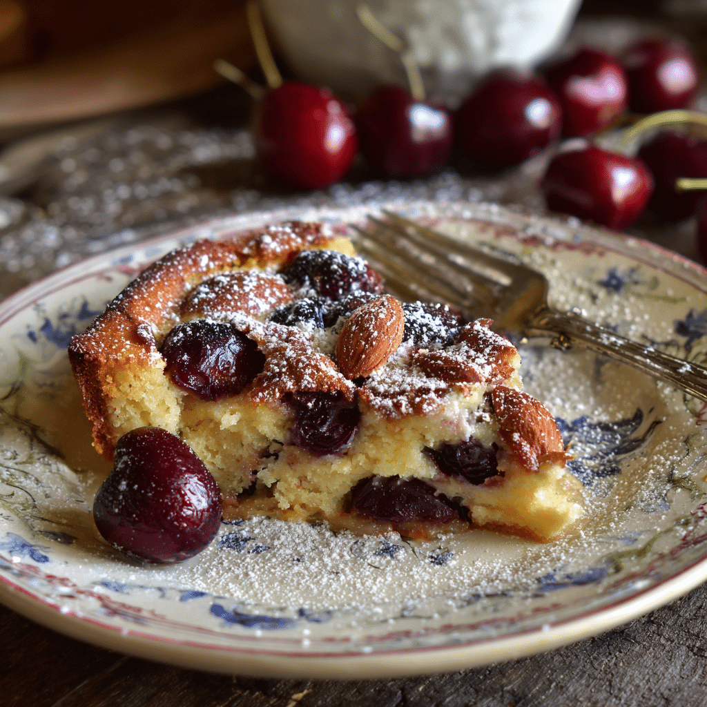 The cherries burst gently while baking. Their juices mix with the almond batter and create little pockets of sweetness. The top turns golden and slightly crisp, while the inside stays tender and creamy.
