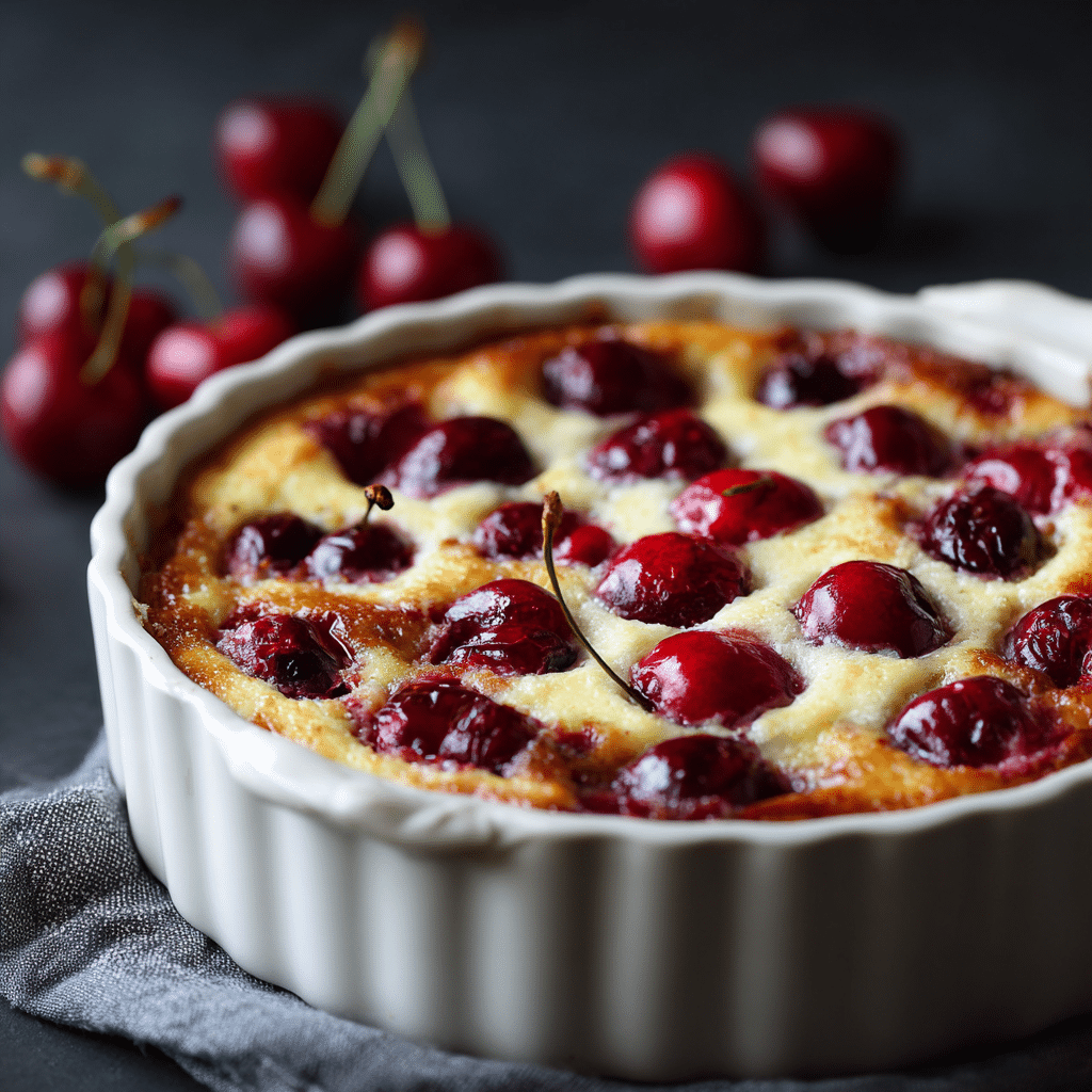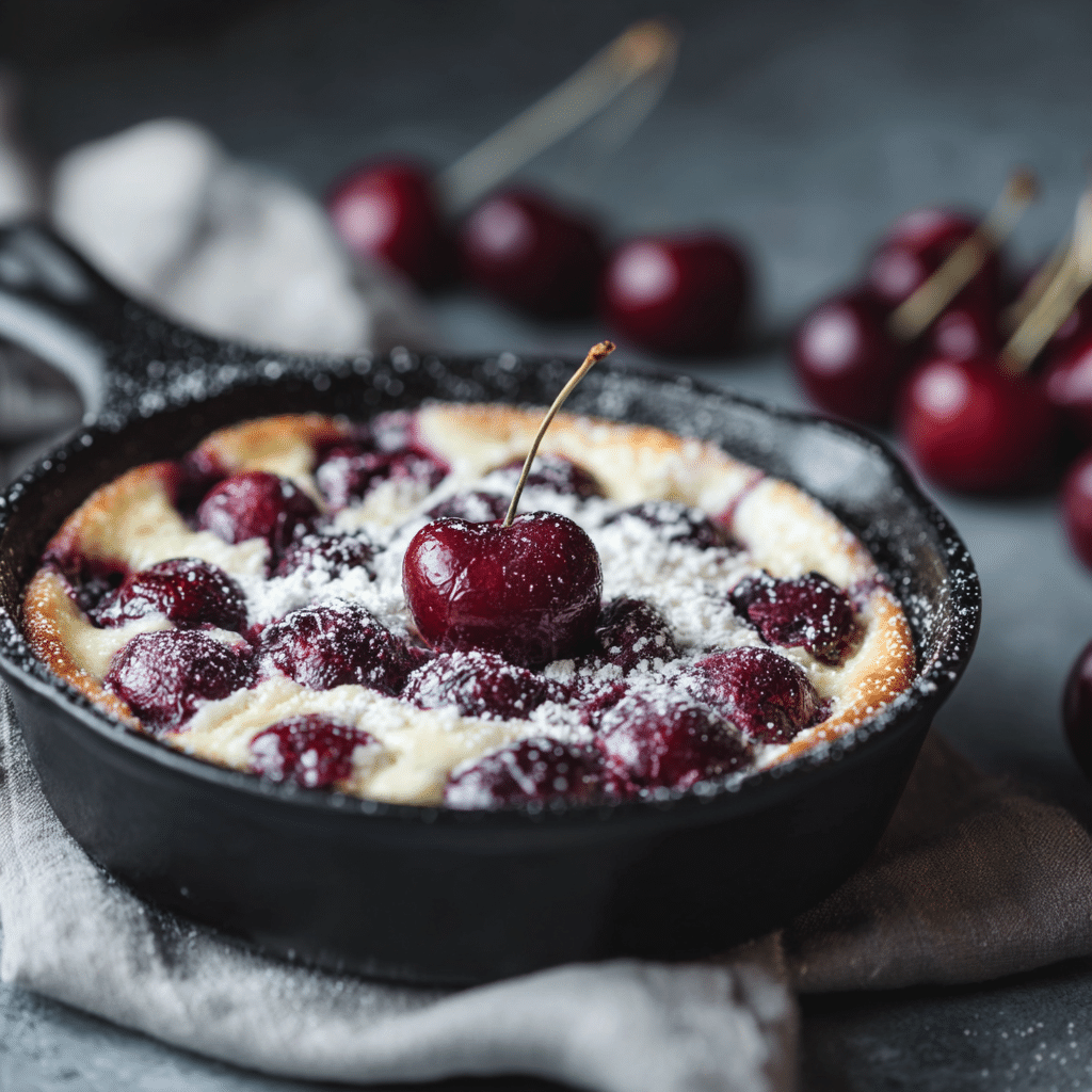 Cherry Clafoutis with Cream is a soft, custard-style French dessert filled with juicy cherries and topped with lightly whipped cream. I whisk eggs, sugar, milk, cream, and flour into a thin batter, pour it over fresh cherries, and bake until golden and gently set. The texture sits between pancake and custard — tender, light, and comforting. I serve it slightly warm with a dusting of powdered sugar and a generous spoon of fresh cream. It feels elegant but requires simple ingredients and minimal effort. This dessert brings warmth, sweetness, and togetherness to any table.
