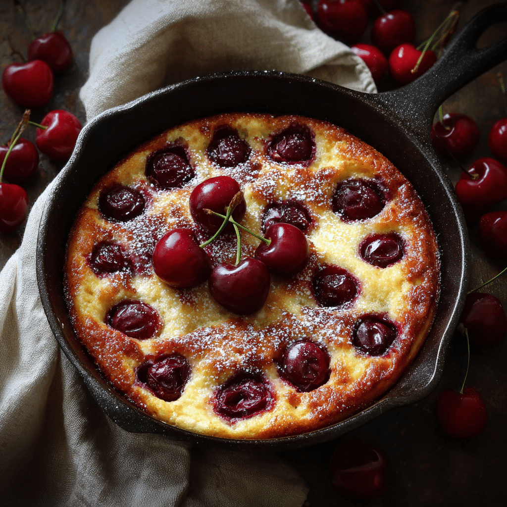 Cherry Clafoutis with Kirsch is a rustic French dessert made with fresh cherries baked in a light custard batter flavored with cherry liqueur. I arrange sweet cherries in a buttered dish, pour a simple mixture of eggs, sugar, flour, milk, cream, and Kirsch over them, and bake until golden and softly set. The result feels delicate, slightly creamy, and beautifully fragrant. I dust it with powdered sugar and serve it warm or at room temperature. It stores well for a few days and tastes even better after resting. It’s simple, elegant, and full of comfort.