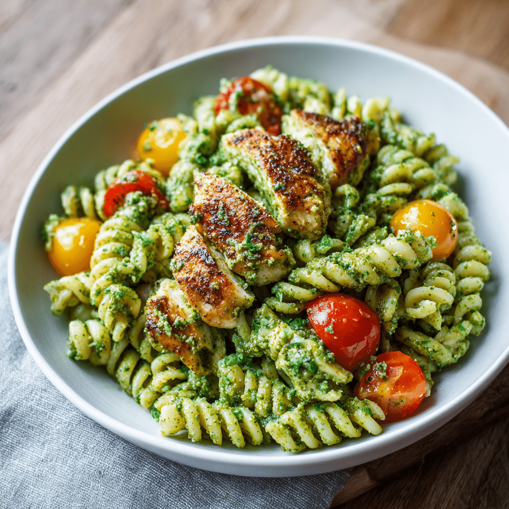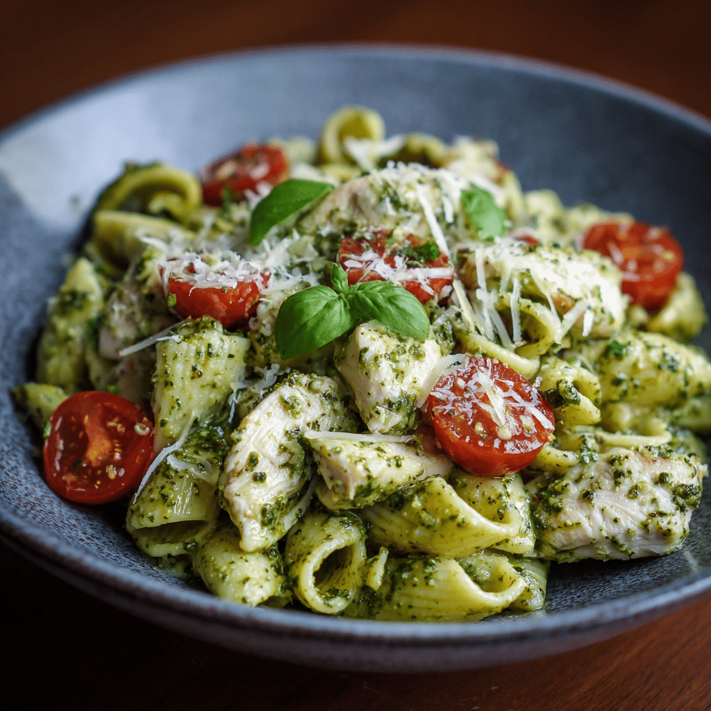 When I serve Chicken Pesto Pasta, I use a big ceramic bowl. I top it with extra Parmesan and fresh basil leaves. Sometimes I drizzle a tiny bit of olive oil on top.