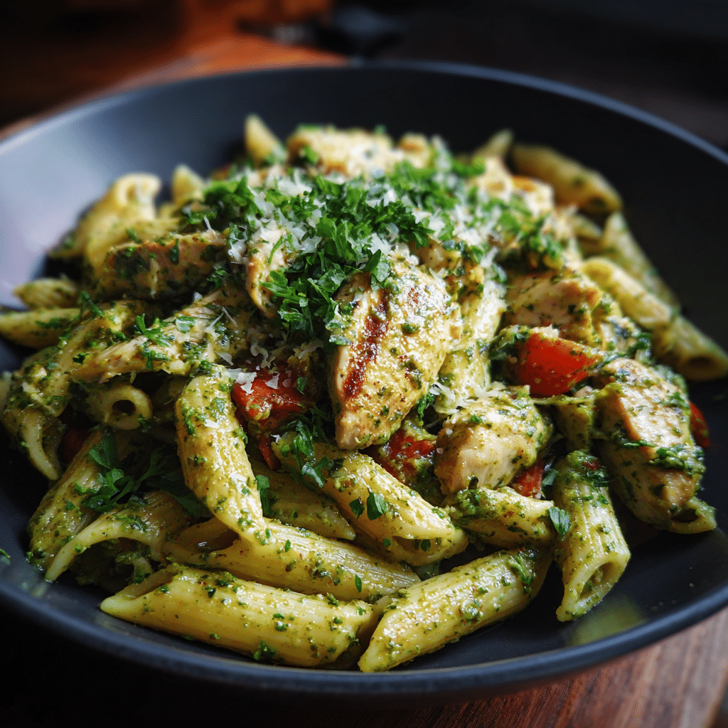 Chicken Pesto Pasta is a quick, comforting dish made with tender chicken, penne pasta, basil pesto, garlic, olive oil, and Parmesan. I cook the pasta until al dente, sauté seasoned chicken until golden, and mix everything with pesto and a splash of cream for extra richness. I finish it with cheese and fresh basil. This recipe comes together in about 30 minutes and works perfectly for busy weeknights or family dinners. It stores well and reheats beautifully with a little extra liquid. Simple ingredients create a flavorful, satisfying meal everyone loves.