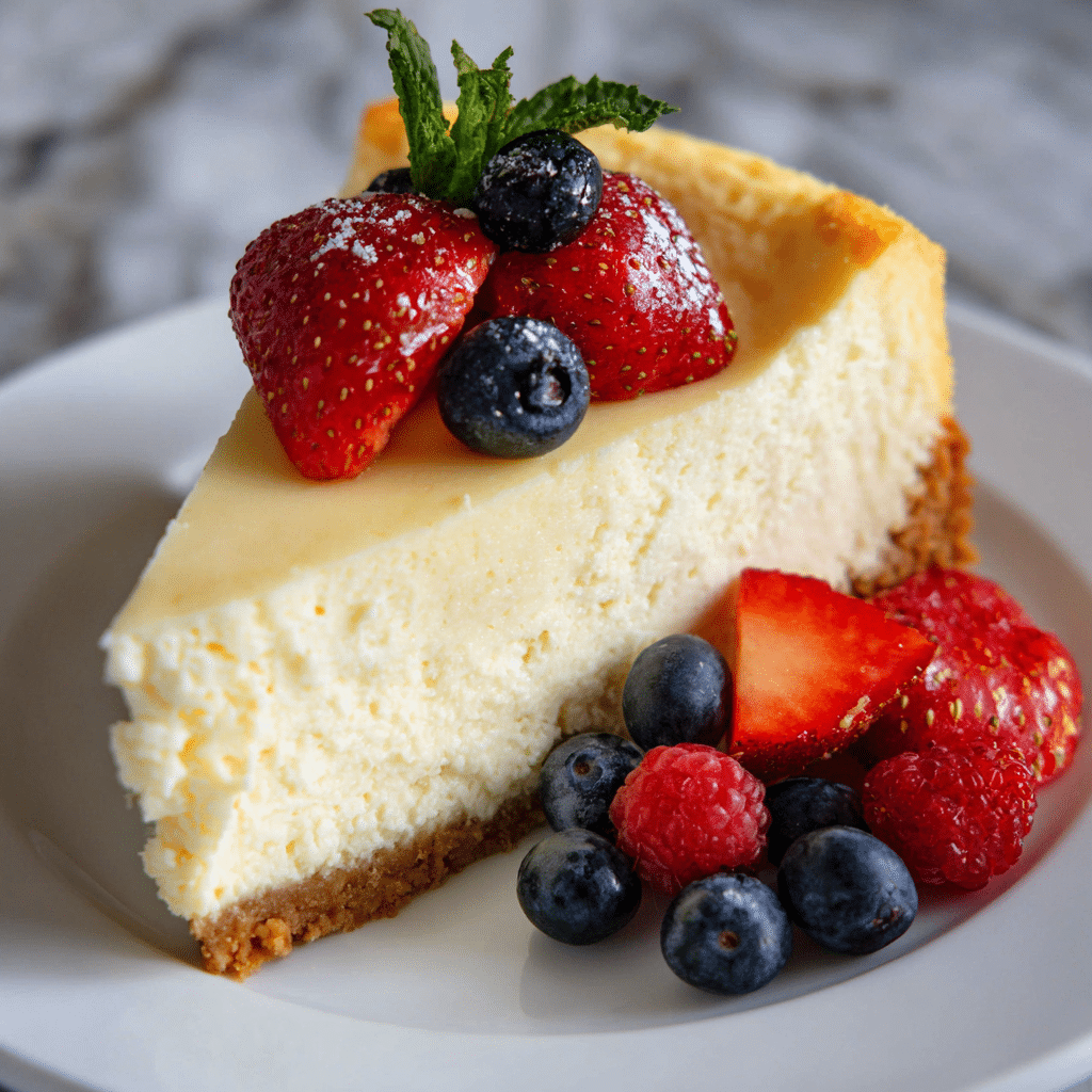 I slice it with a warm knife for clean cuts. I serve it slightly chilled, never too cold. Cheesecake tastes best when it softens just a little at room temperature.