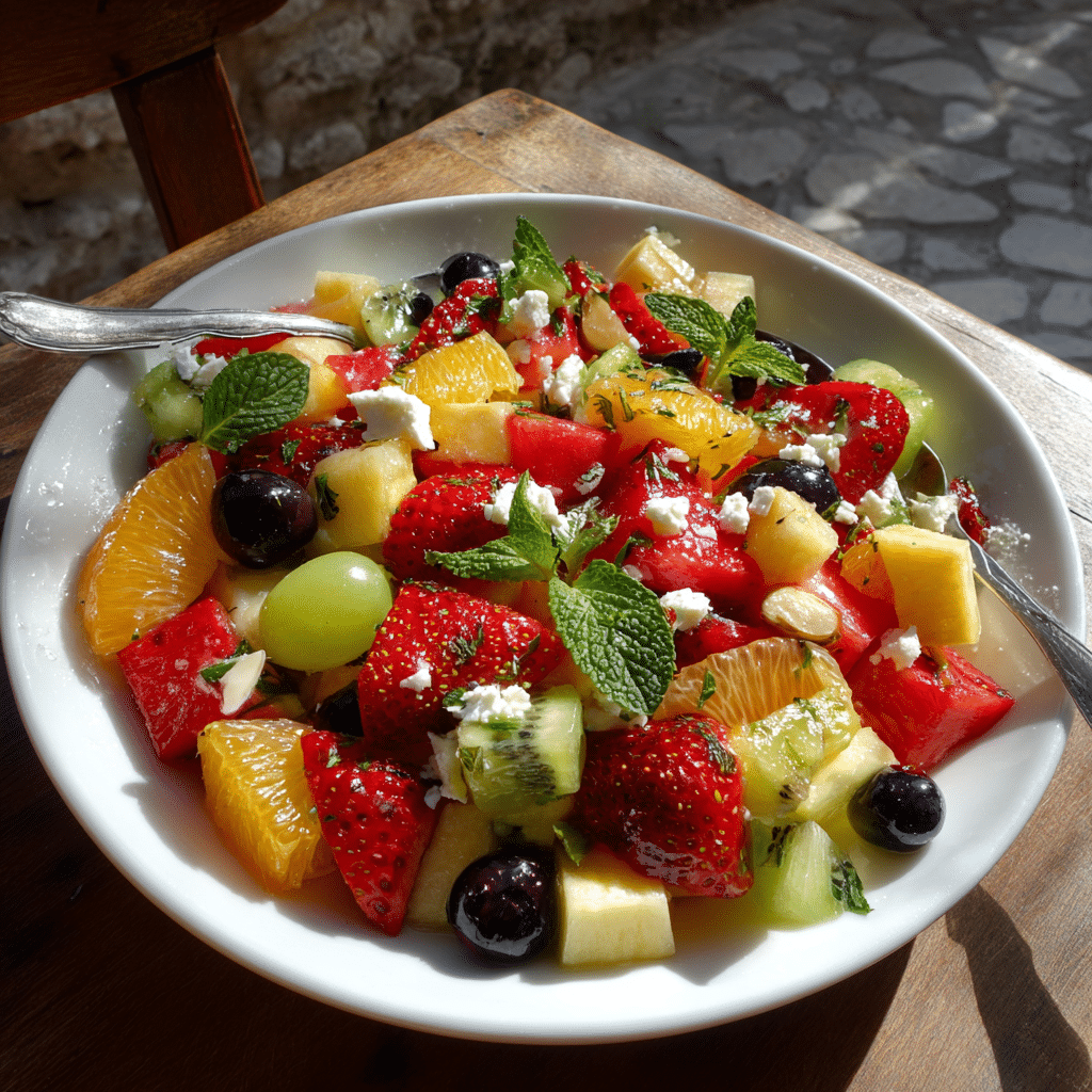 When summer arrives in Crete, the markets explode with color. Watermelons stack high like emerald jewels. Peaches perfume the air. Cherries shine like little rubies. During these hot days, I often prepare my Colorful Summer Fruit Salad. This Colorful Summer Fruit Salad feels refreshing, light, and joyful. It celebrates nature’s sweetness without needing heavy creams or complicated steps.