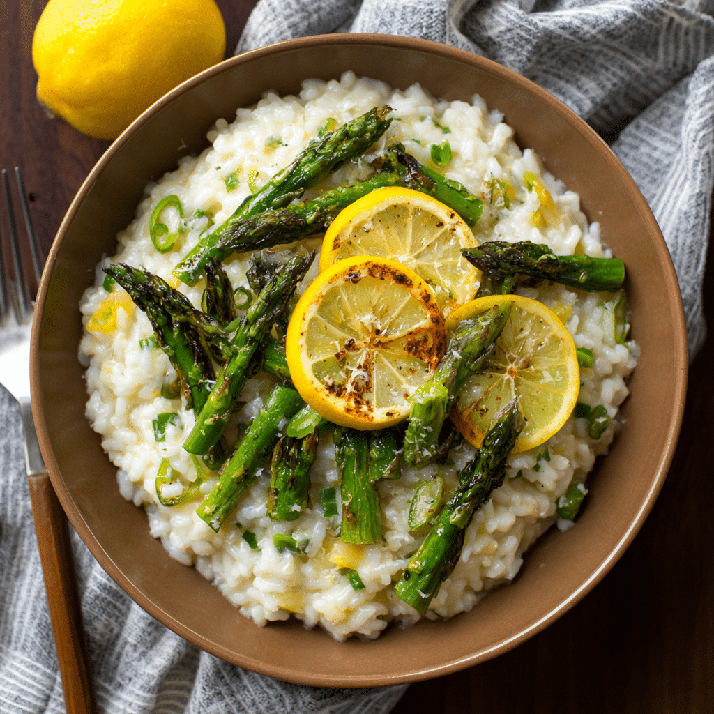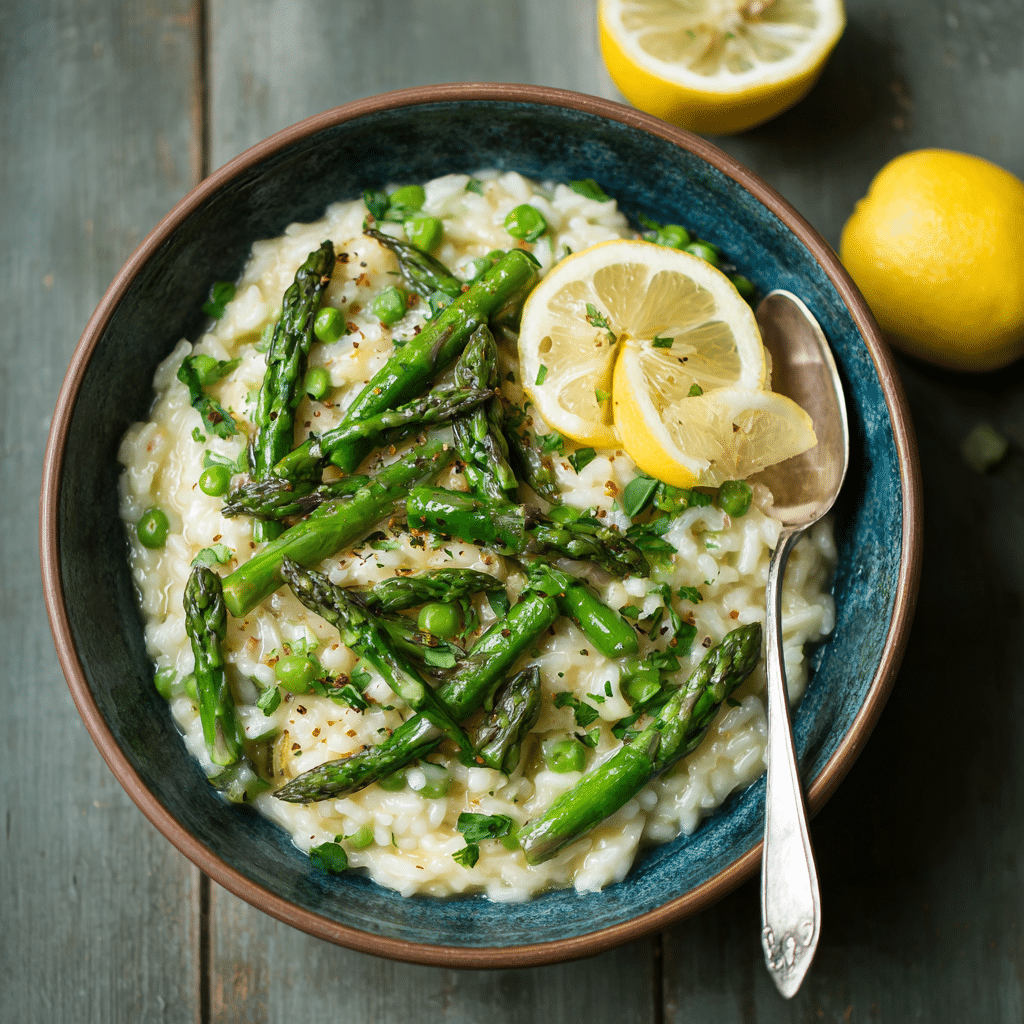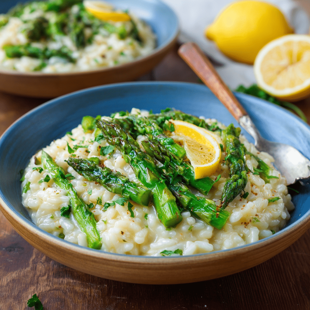 Creamy Lemon Asparagus Risotto is a bright and comforting dish made with Arborio rice, fresh asparagus, lemon zest, and Parmesan cheese. This rich and silky risotto is perfect for spring dinners and elegant homemade meals.
