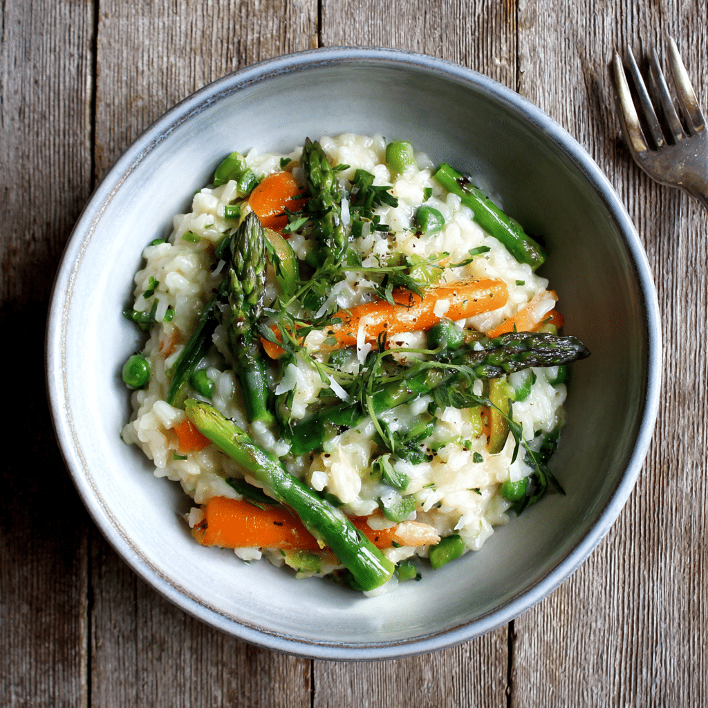 I serve Creamy Spring Vegetable Risotto immediately. Risotto waits for no one.