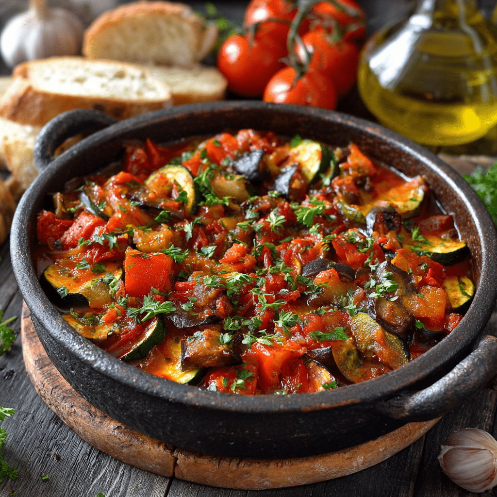 This Easy Ratatouille Recipe is a simple and healthy Mediterranean vegetable dish made with fresh eggplant, zucchini, tomatoes, and bell peppers baked in olive oil and aromatic herbs. Inspired by rustic coastal cooking, this colorful oven-baked ratatouille delivers rich flavor with minimal effort. Perfect as a vegetarian main course or a comforting side dish, it tastes even better the next day and pairs beautifully with crusty bread, grilled fish, or roasted chicken.