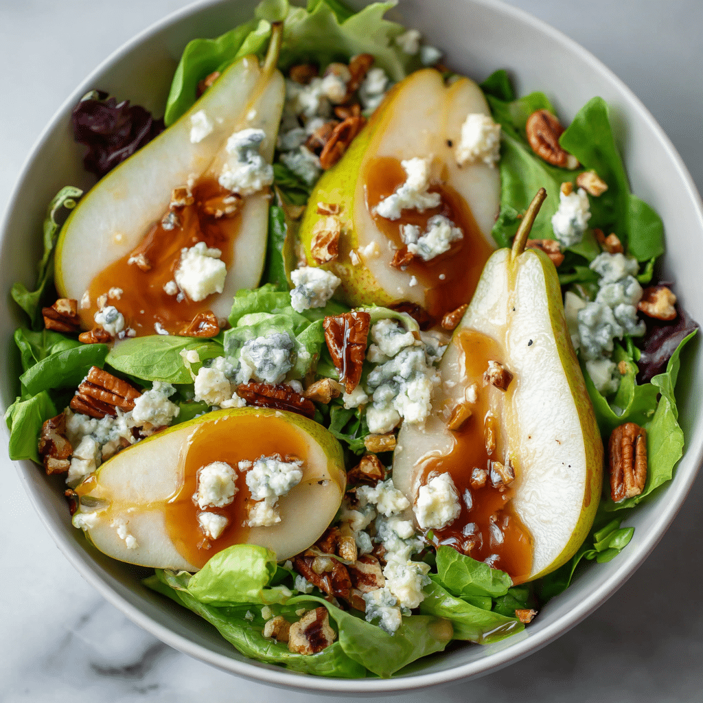 Use firm but ripe pears for the best texture. You can substitute walnuts with pecans or almonds. Keep dressing separate until serving to maintain freshness. Add grilled chicken if you want a more filling meal.