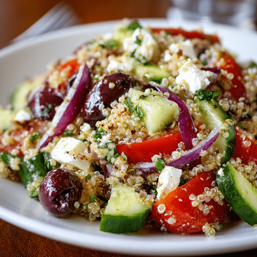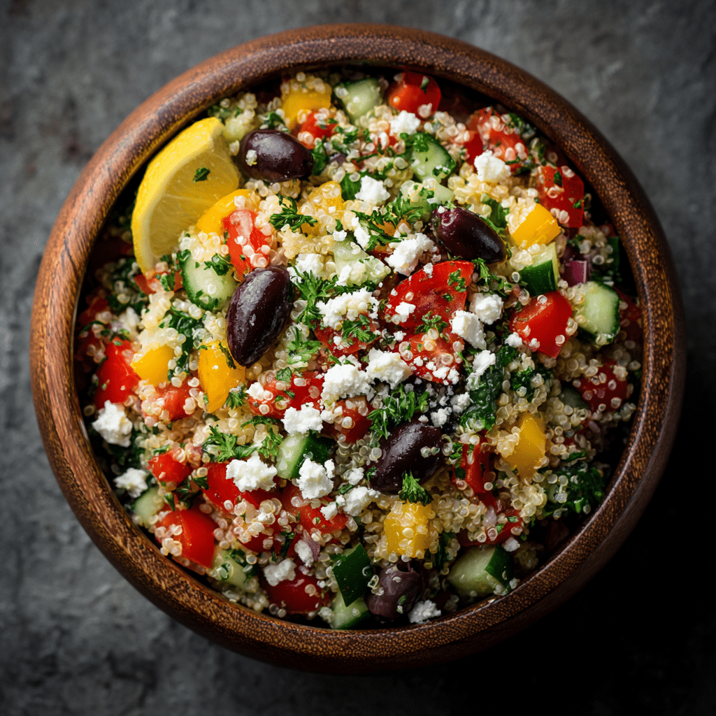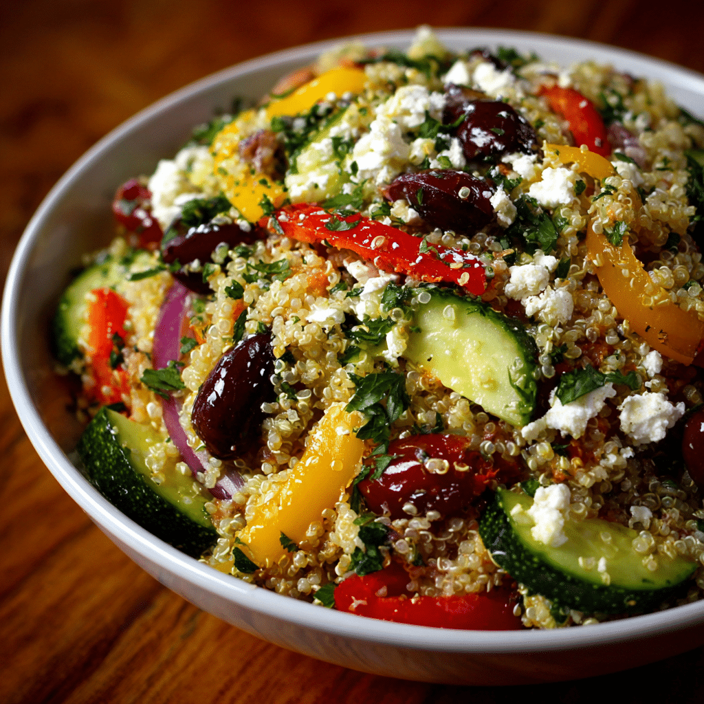 A fresh and vibrant Greek Quinoa Salad made with fluffy quinoa, crisp vegetables, feta cheese, and a zesty lemon olive oil dressing. Perfect for healthy meals and meal prep.