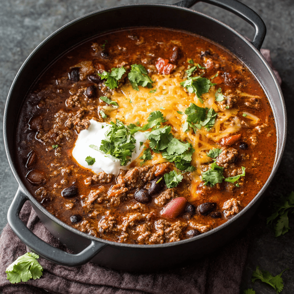 This Ground Beef Chili Recipe is a hearty, comforting one-pot meal packed with ground beef, beans, tomatoes, bell peppers, and warm spices. Simmered slowly for rich flavor, it creates the perfect balance of spice and depth. Easy to prepare and ideal for meal prep, this chili works for family dinners or gatherings with friends. Serve it with cheese, yogurt, or fresh herbs for a customizable bowl everyone will love. It stores and freezes beautifully, making it a practical and delicious recipe for busy weeks.