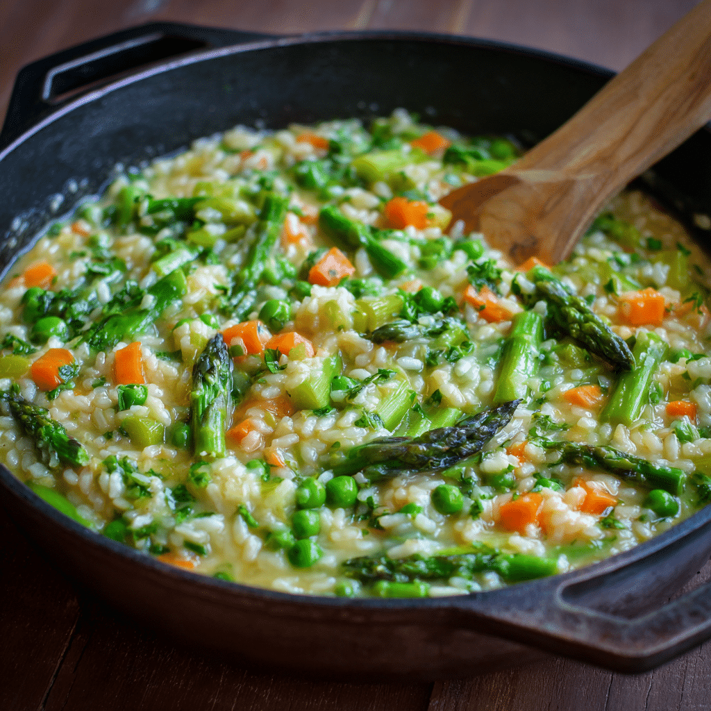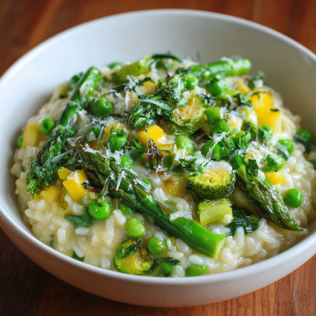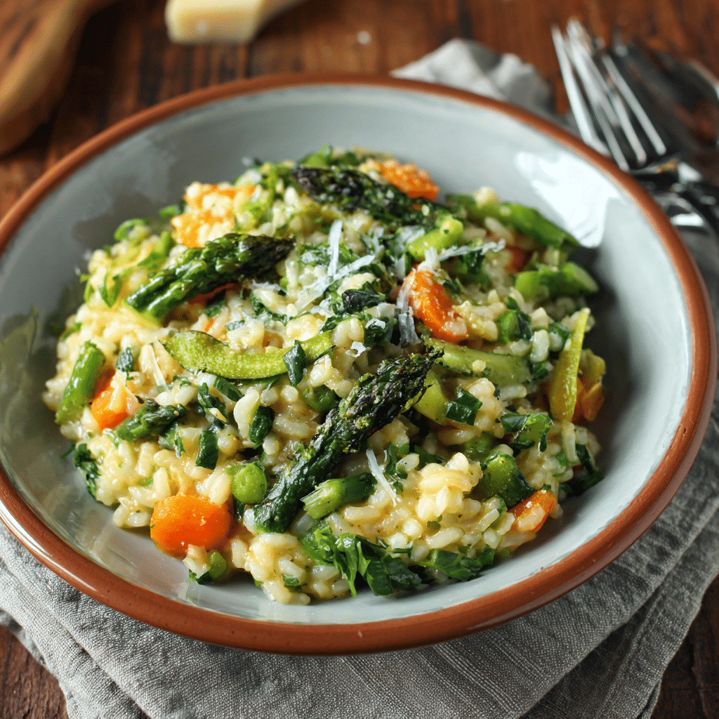 This Healthy Spring Vegetable Risotto is creamy, fresh, and full of seasonal vegetables like zucchini, peas, and asparagus. Made with Arborio rice and finished with Parmesan and lemon, it’s a light yet comforting vegetarian meal perfect for spring.