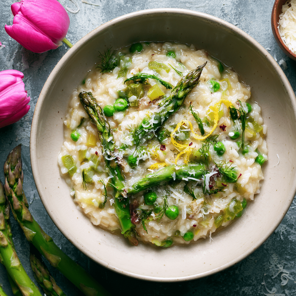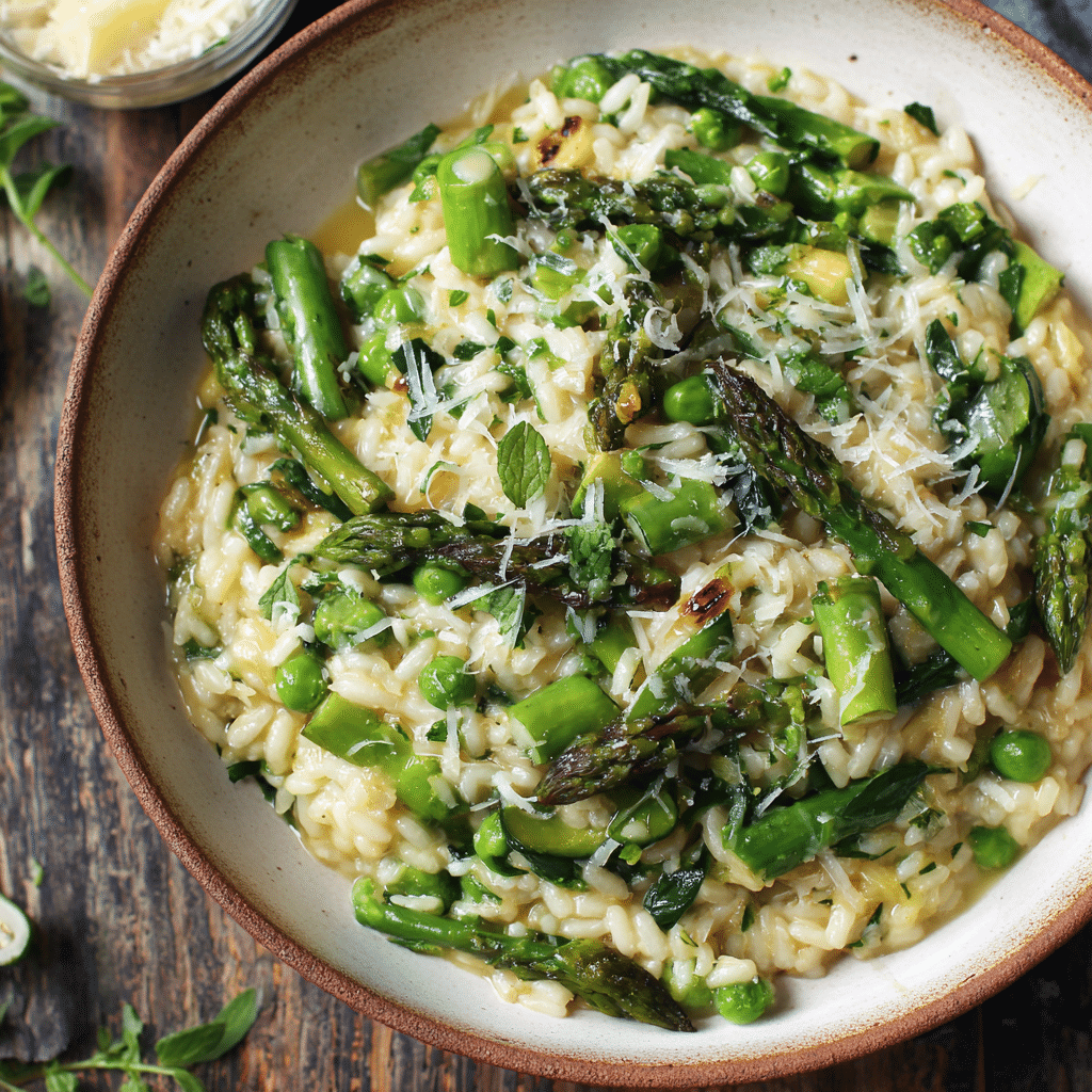 This Italian Spring Vegetable Risotto is creamy, fresh, and full of asparagus, peas, and zucchini. Made with Arborio rice and finished with Parmesan and lemon zest, it is a comforting yet light seasonal dish perfect for spring dinners.