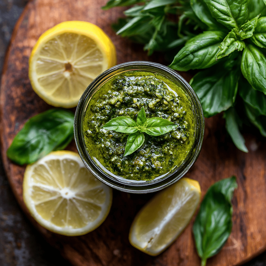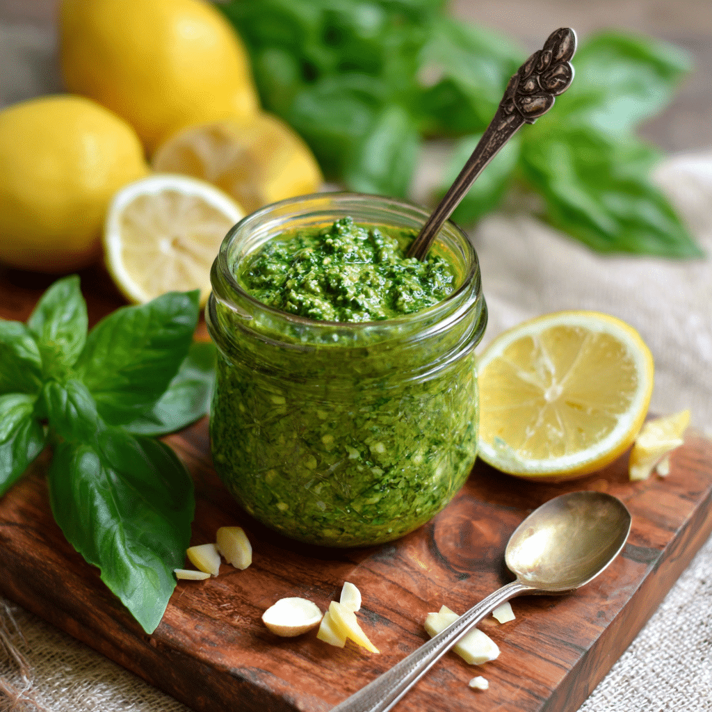I make Lemon Basil Pesto with fresh basil leaves, lemon zest, lemon juice, toasted pine nuts, garlic, Parmesan cheese, and extra virgin olive oil. I blend everything until smooth and creamy. This pesto tastes bright, fresh, and slightly tangy. I toss it with pasta, spread it on toast, or spoon it over grilled chicken or vegetables. I store it in a jar with a thin layer of olive oil on top and refrigerate it for up to five days. I can also freeze it in small portions for later. It brings sunshine and freshness to any simple meal.