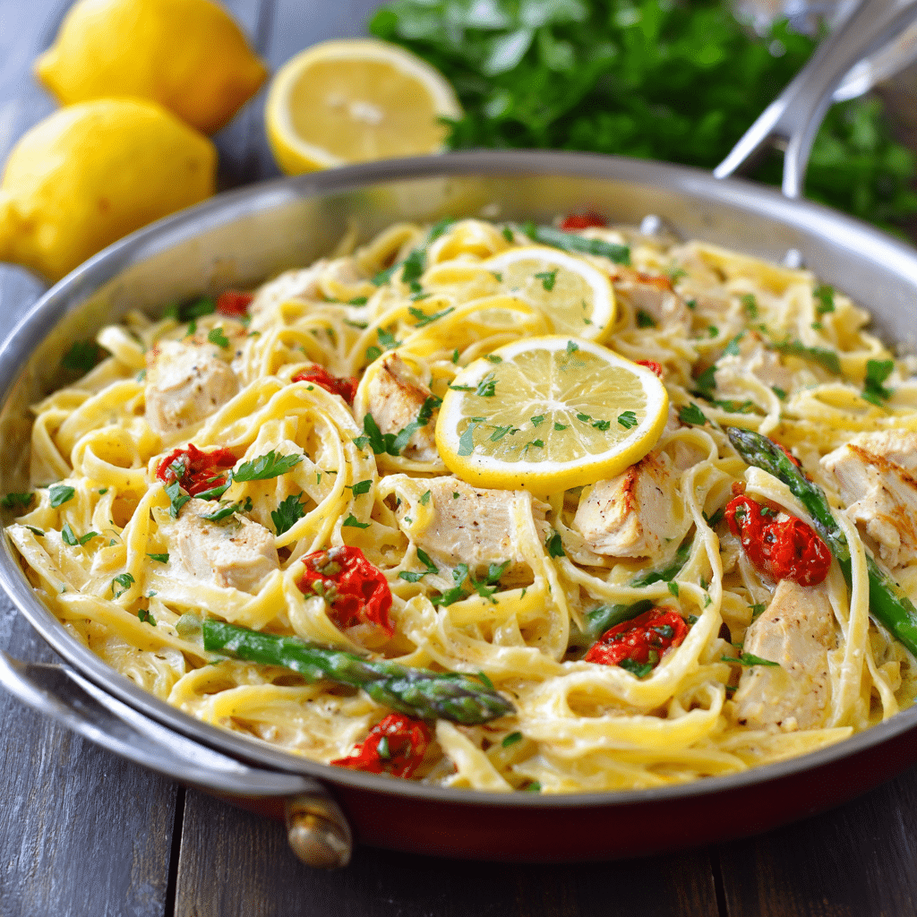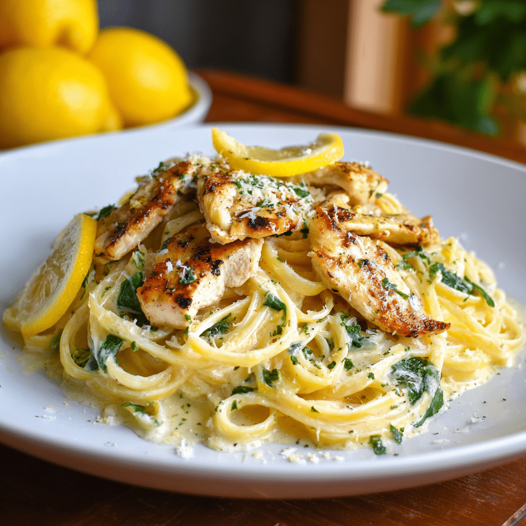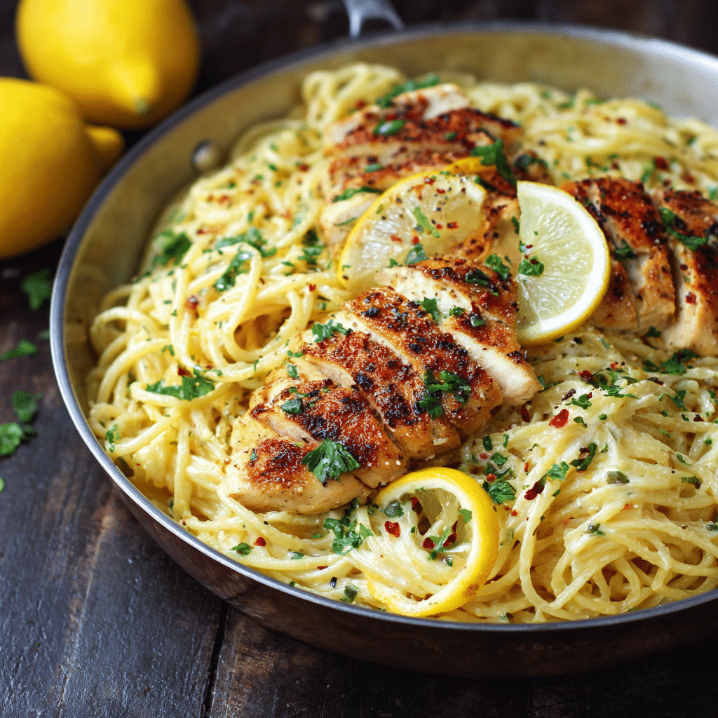 I cook pasta until al dente and reserve pasta water. I sauté sliced chicken in olive oil until golden. I remove the chicken and cook garlic briefly. I add lemon zest, lemon juice, and cream if desired. I return the chicken to the pan, add pasta and pasta water, and toss until coated. I stir in Parmesan cheese and finish with fresh parsley. Lemon Pasta with Chicken tastes bright, creamy, and comforting — perfect for an easy weeknight dinner.