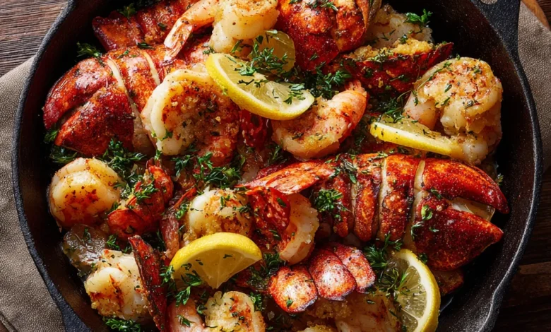 My American friends always expect a show when I make this Lobster & Shrimp Cast-Iron Dinner, because honestly… she is a show-stopper. Golden lobster tails, plump shrimp, lemony-buttery garlic sauce, and a fragrant mix of herbs all together in one sizzling pan.