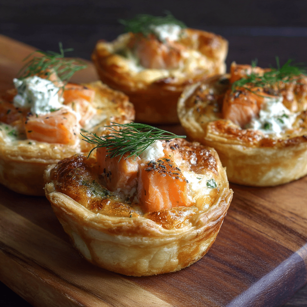 Use leftover baked or poached salmon for best texture. Do not overfill the crusts to prevent spilling during baking. Store in the refrigerator for up to 3 days or freeze for up to 1 month. Reheat in the oven at 160°C (320°F) for 8–10 minutes for best results.