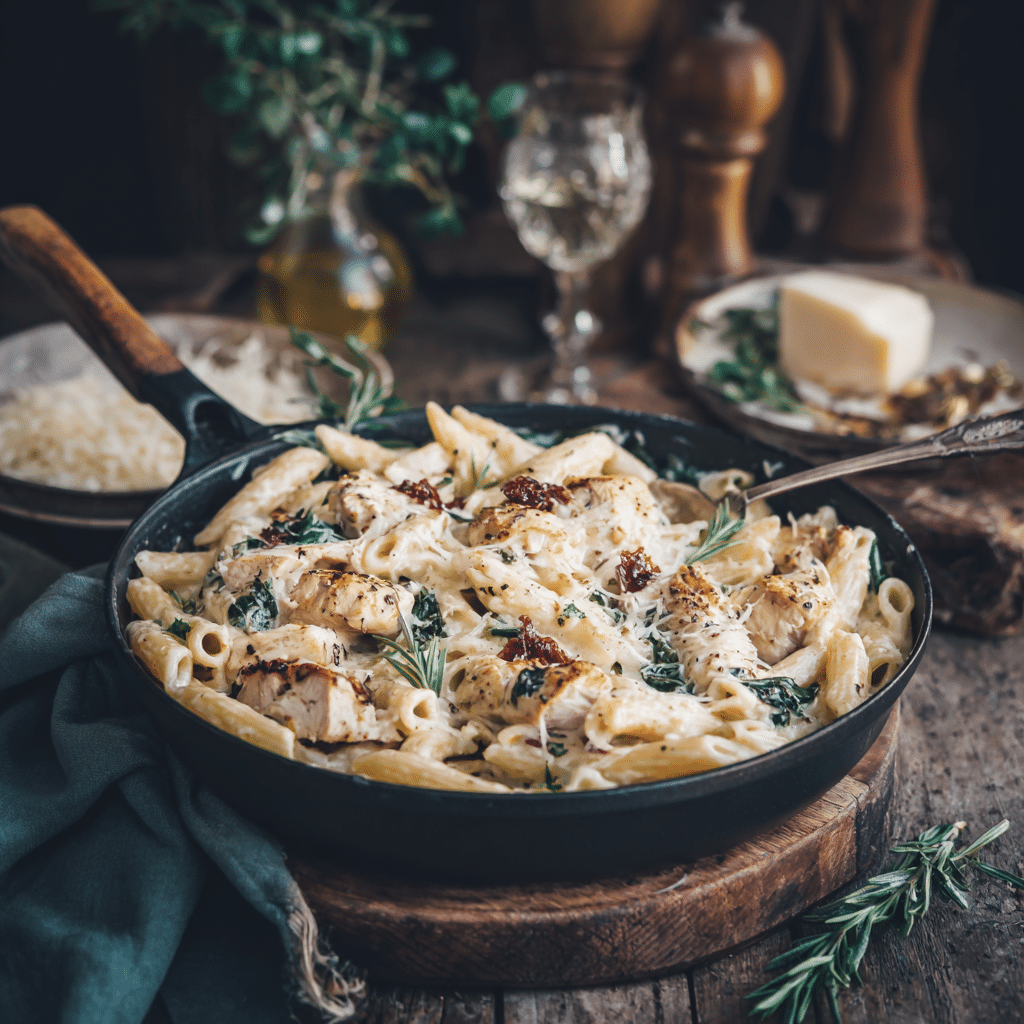I cook sliced chicken in olive oil and butter until golden. I remove it, sauté garlic, then add chicken broth and heavy cream. I bring it to a simmer and add uncooked pasta directly into the pot. I cook everything together until the pasta becomes tender and the sauce thickens naturally. I stir in parmesan cheese, a pinch of nutmeg, and return the chicken. I finish with fresh parsley and serve immediately. This One Pot Chicken Alfredo Pasta tastes creamy, comforting, and perfect for busy evenings when I want something simple but deeply satisfying.