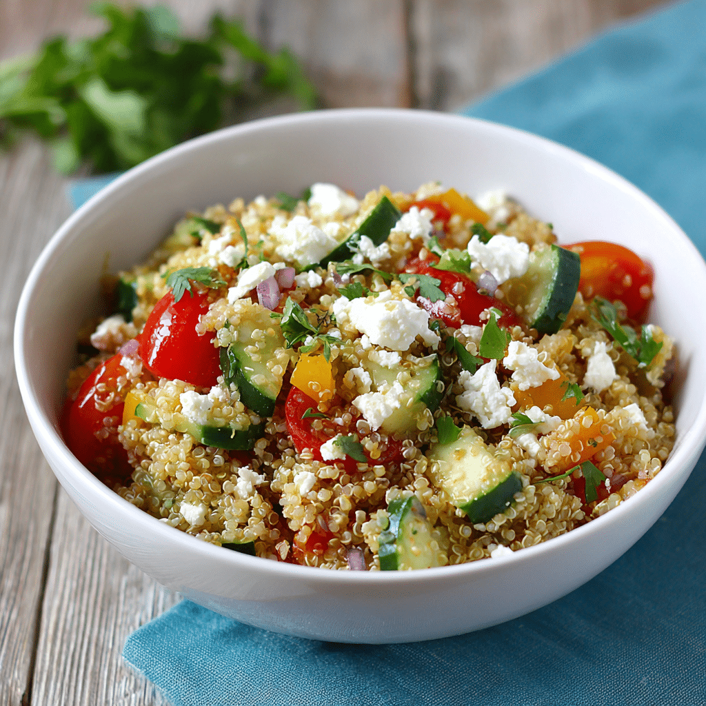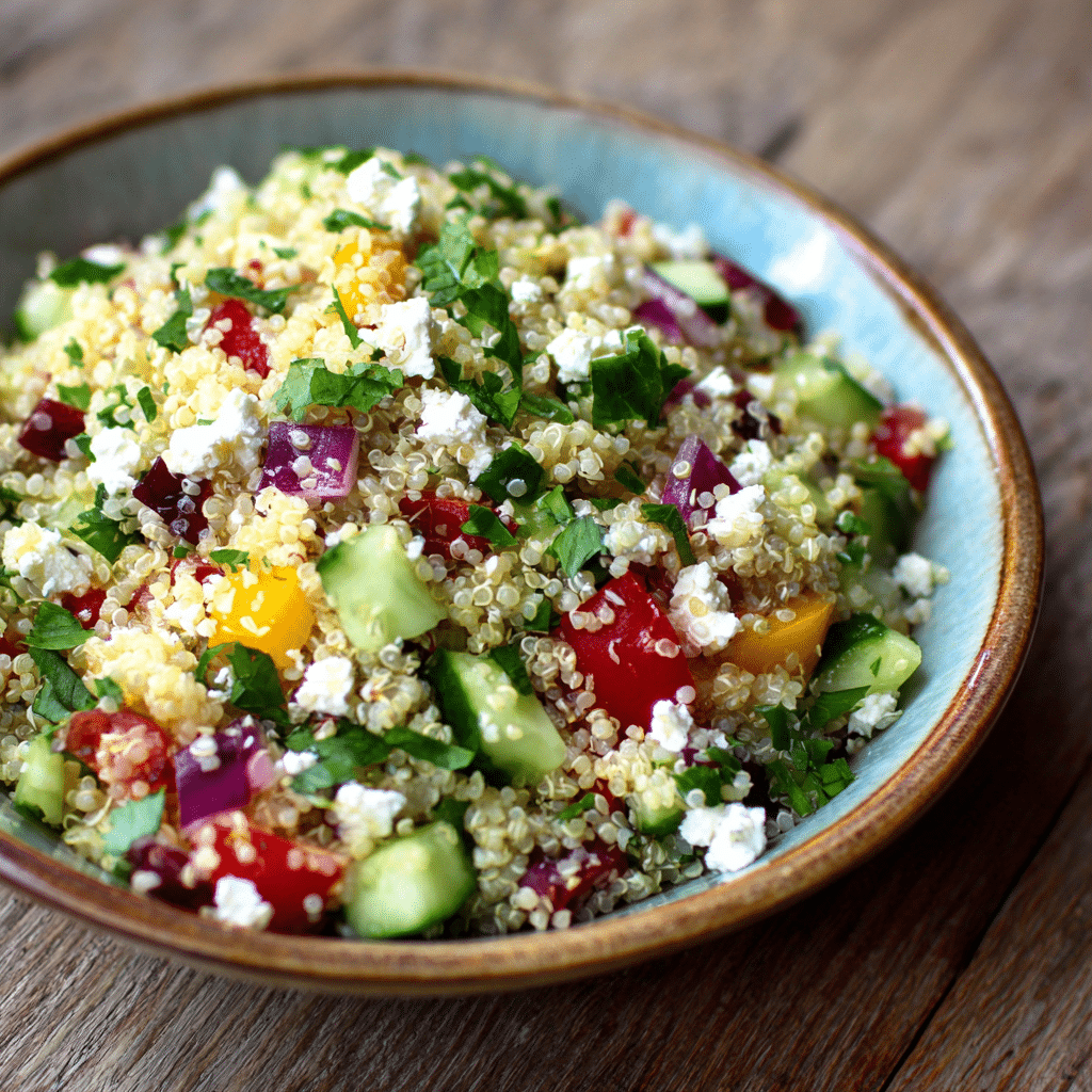 This fresh and vibrant quinoa salad with feta is a wholesome Mediterranean dish packed with flavor, texture, and nutrition. Made with fluffy quinoa, crisp vegetables, creamy feta cheese, and a zesty lemon dressing, it’s perfect for a healthy lunch, light dinner, or meal prep option.