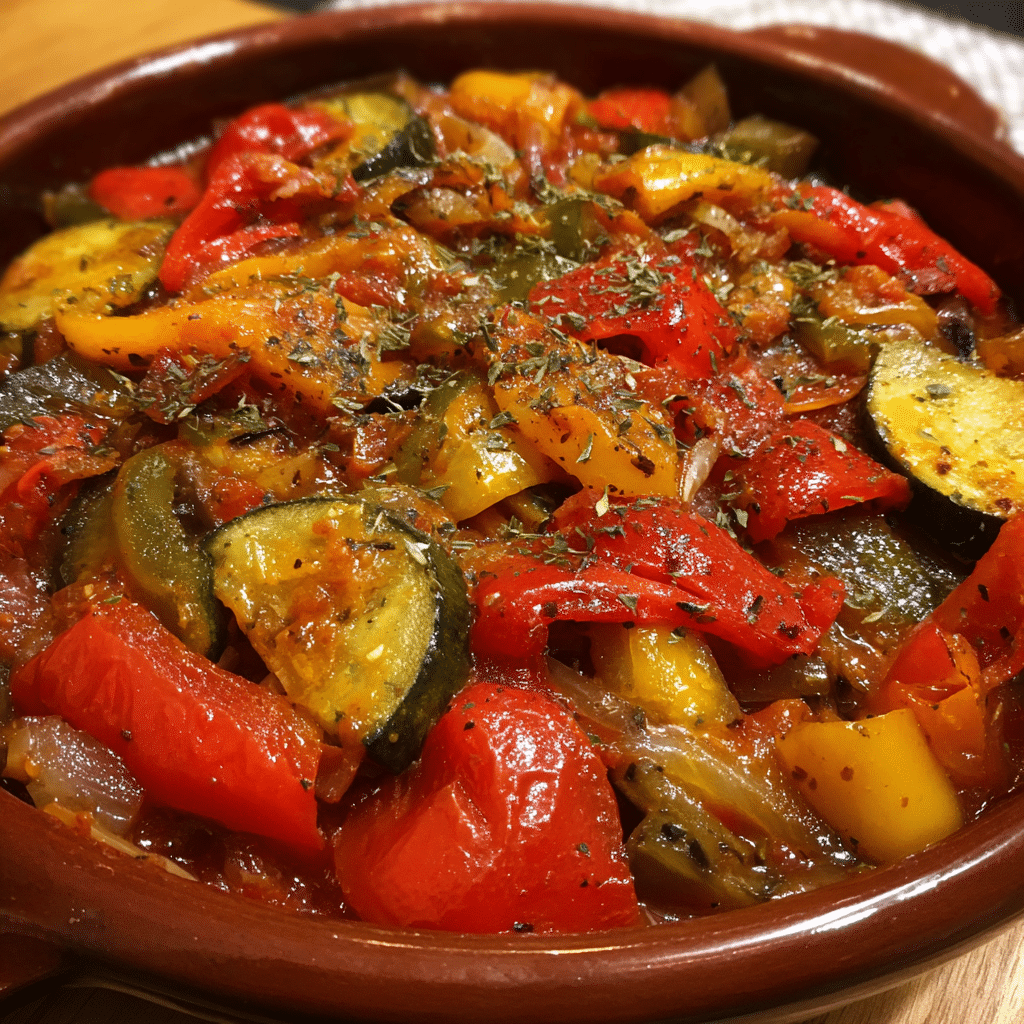 Ratatouille with Tomatoes and Peppers is a comforting Mediterranean vegetable dish made with eggplant, zucchini, bell peppers, tomatoes, garlic, and herbs simmered in olive oil. This rustic recipe celebrates simple ingredients and bold flavors. Serve it warm with crusty bread, grilled meat, or enjoy it on its own. It stores well and tastes even better the next day. Perfect for summer meals, family dinners, or healthy weeknight cooking.