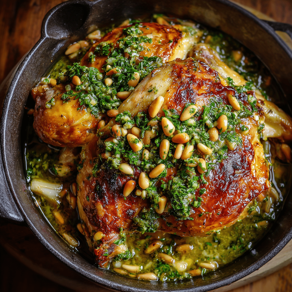 Toast pine nuts for better flavor. Baste the chicken during roasting to keep it moist. Let it rest before carving for juicier meat.