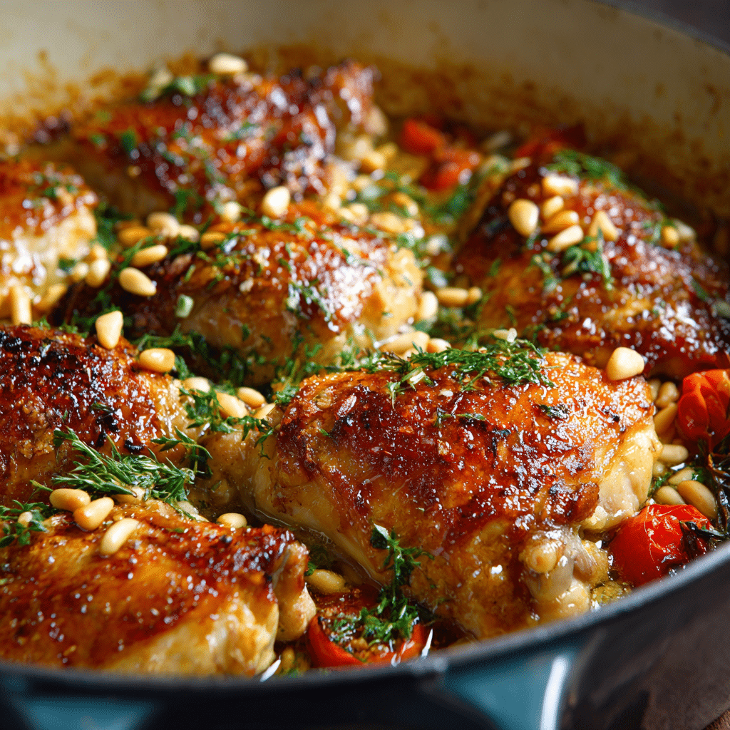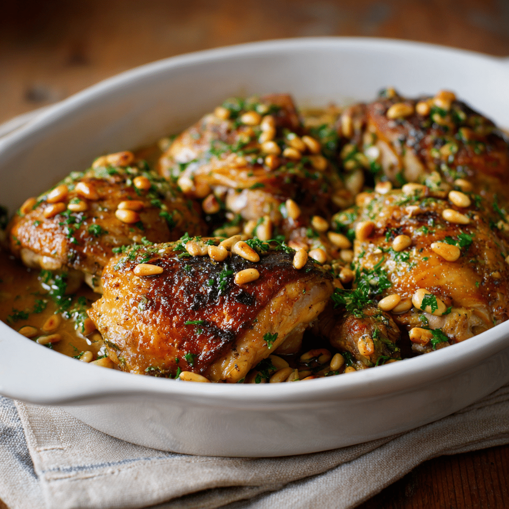 Now, Roasted Chicken with Pine Nuts holds a steady place in my kitchen. I make Roasted Chicken with Pine Nuts when I want to bring everyone together around the table, when I want to create a meal that feels both nourishing and quietly elegant. And every time I serve Roasted Chicken with Pine Nuts, I see that same gentle satisfaction on people’s faces, the kind that only home-cooked food can bring.