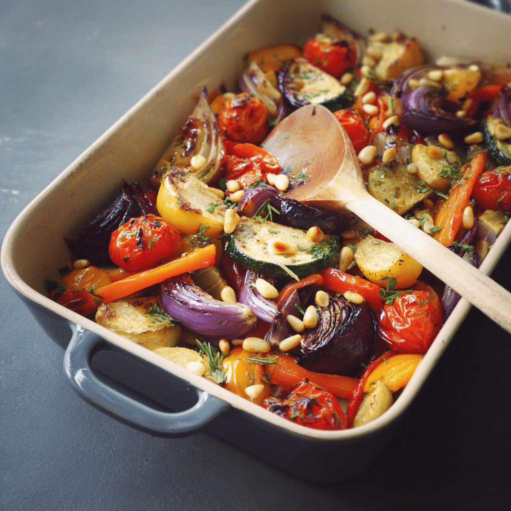 When I make Roasted Vegetables with Pine Nuts, I always think of late afternoons in my grandmother’s small kitchen. The sunlight would come through the window, touching the wooden table where she would chop vegetables slowly, never rushing. The smell of olive oil warming in the oven would fill the house, and I would sit nearby, waiting for that magical moment when everything turned golden and soft.