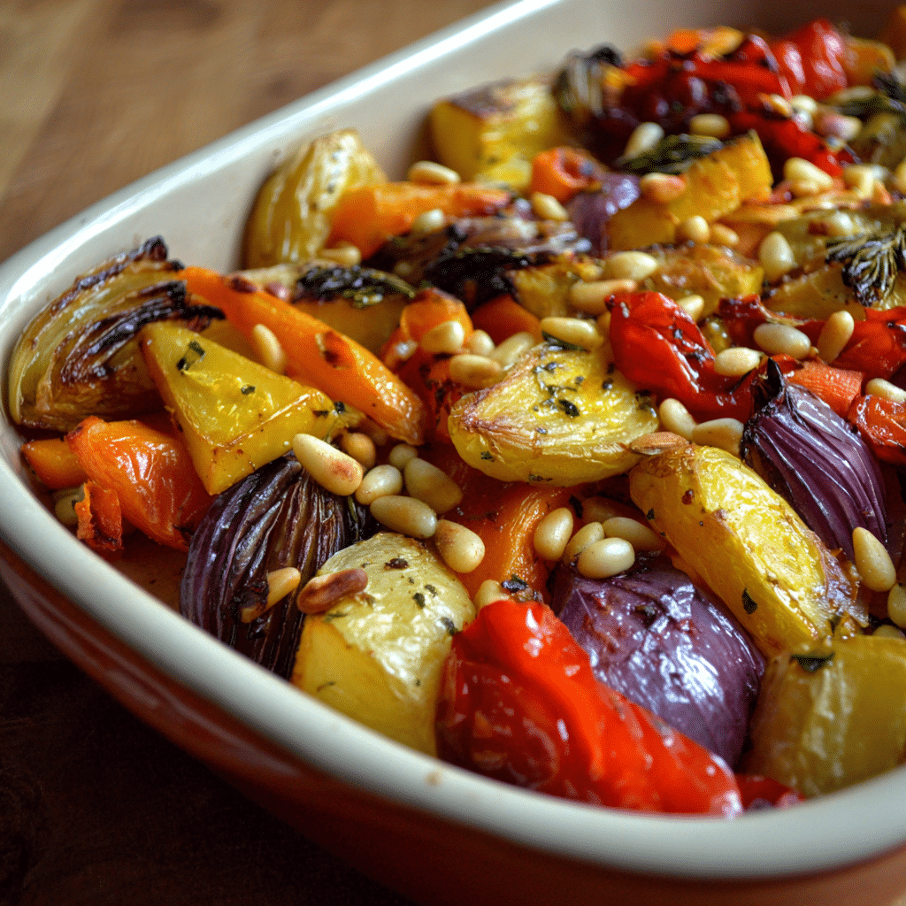 Roasted Vegetables with Pine Nuts is a simple, healthy, and flavorful dish made with fresh seasonal vegetables, olive oil, and toasted pine nuts. This Mediterranean-inspired recipe delivers a perfect balance of sweetness and nuttiness, making it an ideal side dish or light meal.