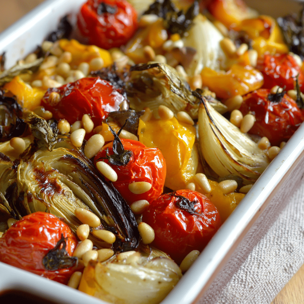 I love this recipe because it feels honest. I don’t need fancy tools or complicated steps. I take fresh vegetables, good olive oil, and a handful of pine nuts, and I let the oven do its magic.