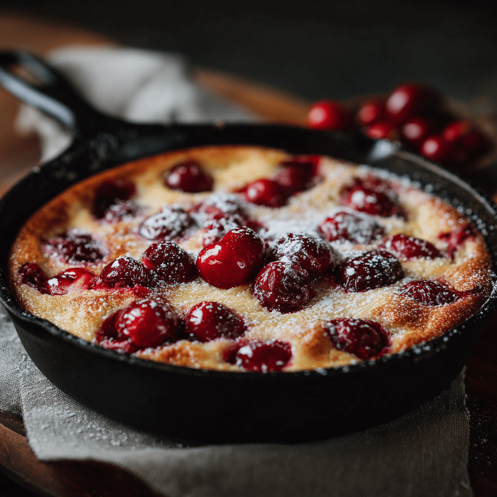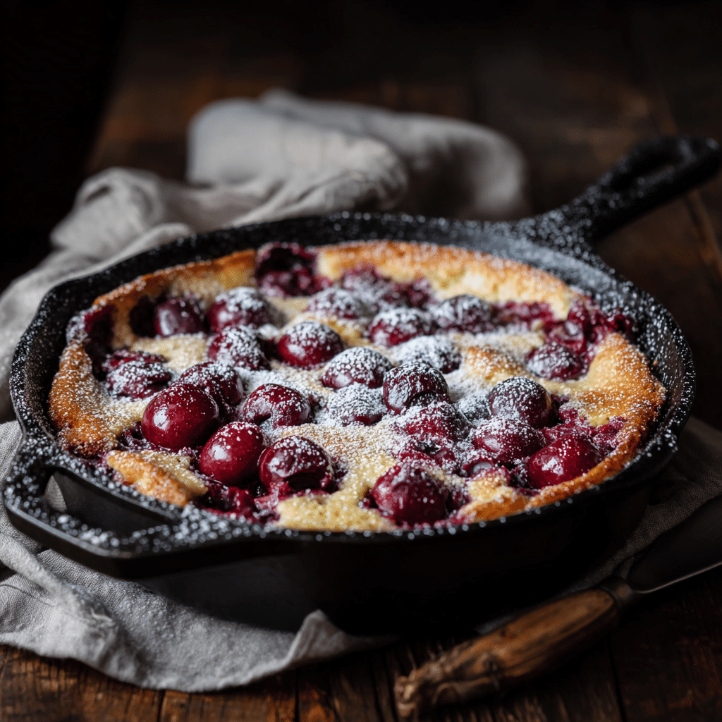 This dessert feels honest. It looks humble, almost like a pancake that puffed up proudly around juicy cherries. But when you cut into it, you discover something silky, custardy, and rich.