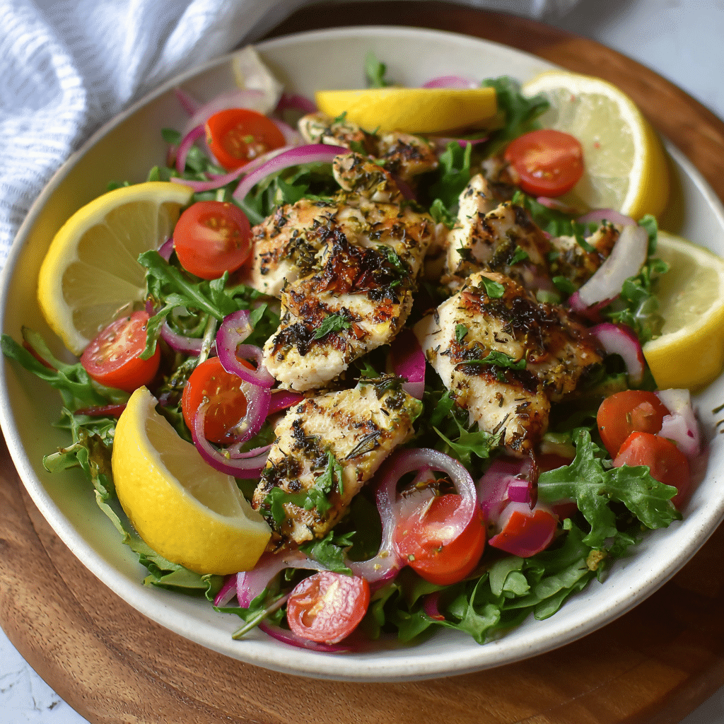 This Simple Lemon Chicken Salad Recipe is fresh, healthy, and full of bright Mediterranean flavor. I marinate chicken breasts in lemon, garlic, olive oil, and oregano, then grill them until juicy and golden. I toss crisp romaine lettuce with cherry tomatoes, cucumber, red onion, and parsley. I top the salad with sliced chicken and drizzle a homemade lemon dressing made with olive oil, honey, and Dijon mustard. This salad feels light yet satisfying and works perfectly for lunch, dinner, or meal prep. It tastes like sunshine in a bowl and always brings freshness to my table.