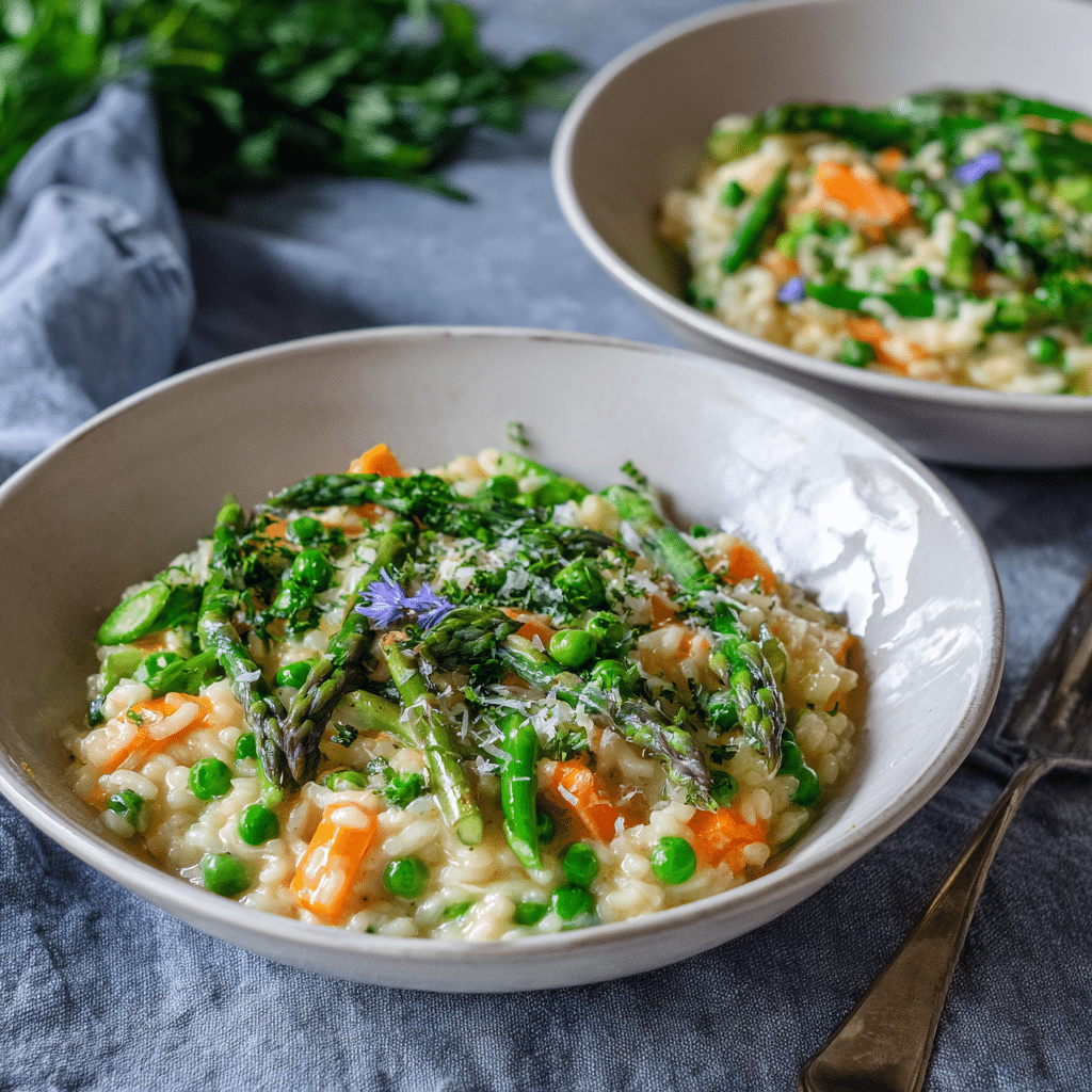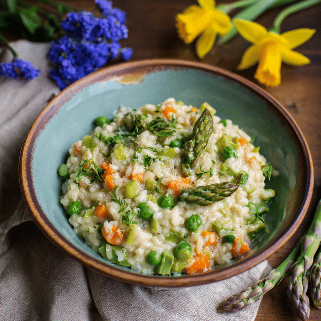 This simple spring vegetable risotto feels like a celebration of the season. I use fresh asparagus, sweet peas, tender zucchini, and fragrant herbs. I stir slowly, patiently, and I watch how the rice transforms into something creamy and comforting. This simple spring vegetable risotto always reminds me that beautiful food does not need to be complicated.