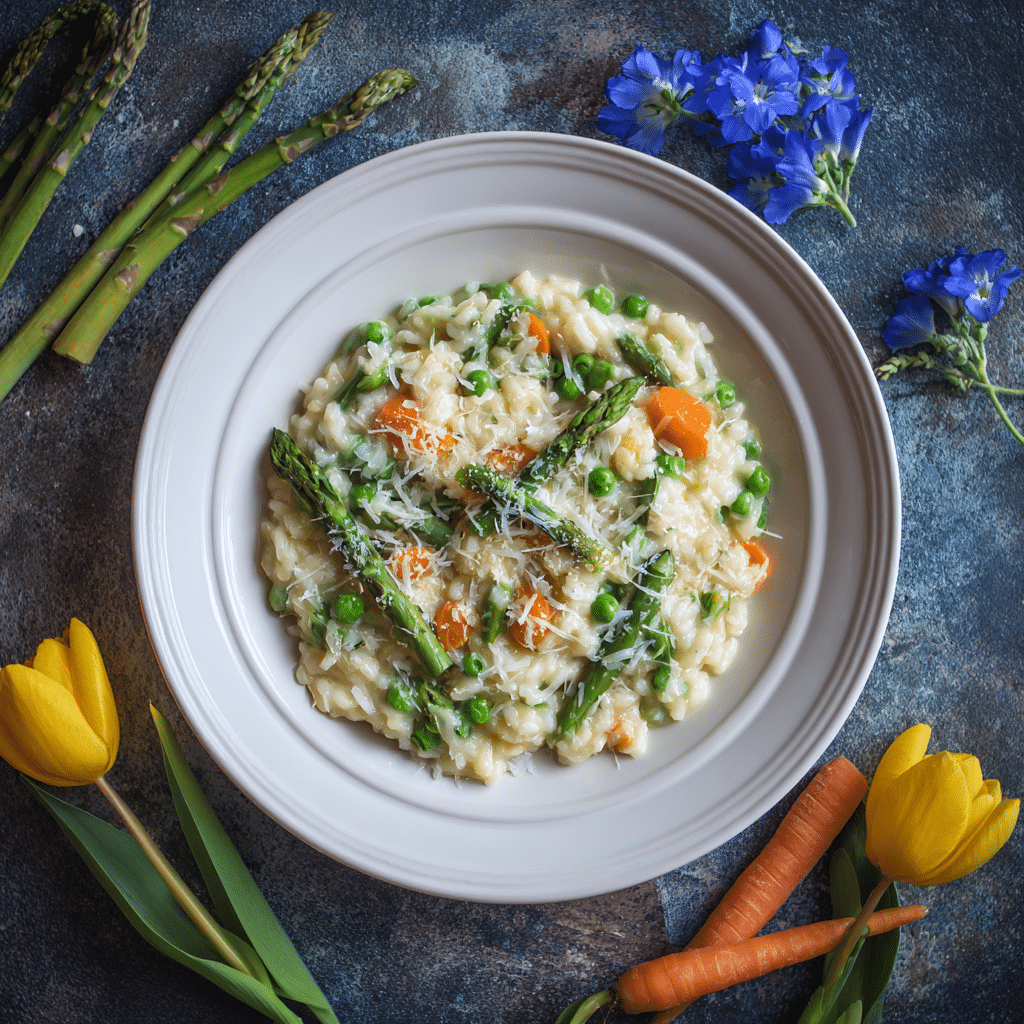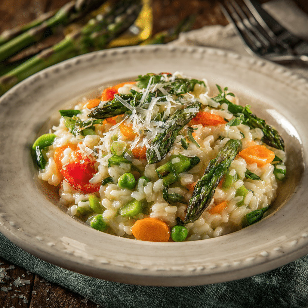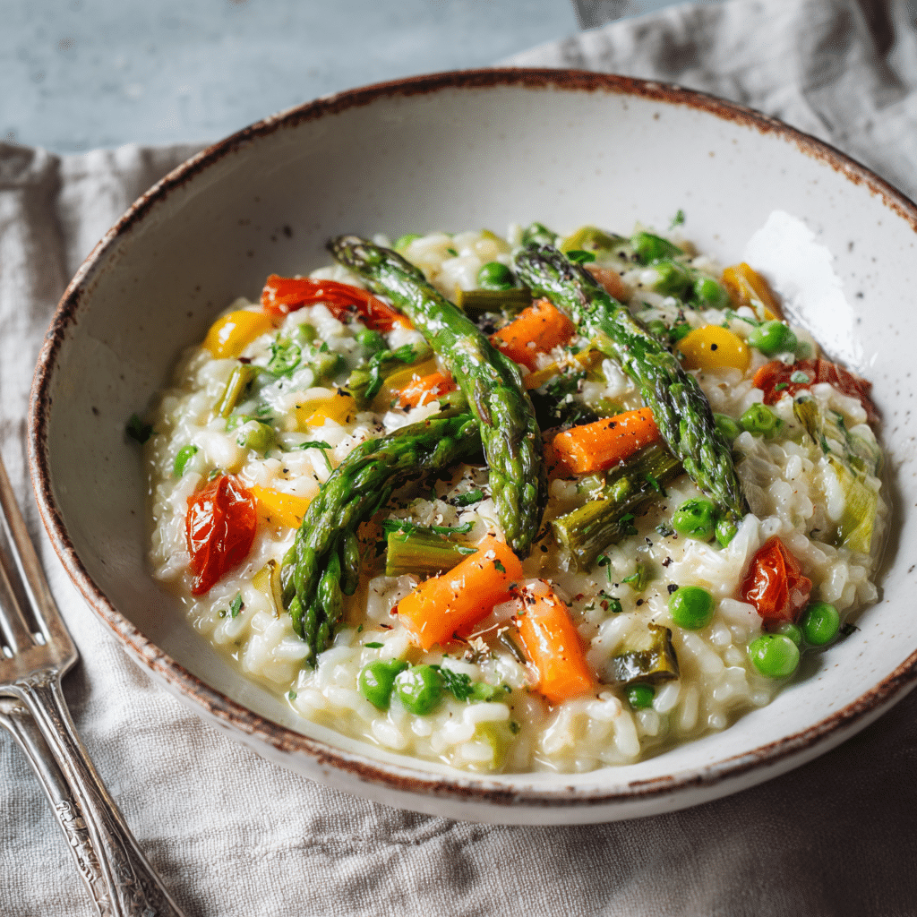 This Spring Garden Vegetable Risotto is a creamy, comforting vegetarian dish made with Arborio rice, fresh asparagus, sweet peas, zucchini, Parmesan cheese, and bright lemon zest. It celebrates seasonal vegetables and delivers rich flavor with a beautifully creamy texture — perfect for a fresh spring dinner.