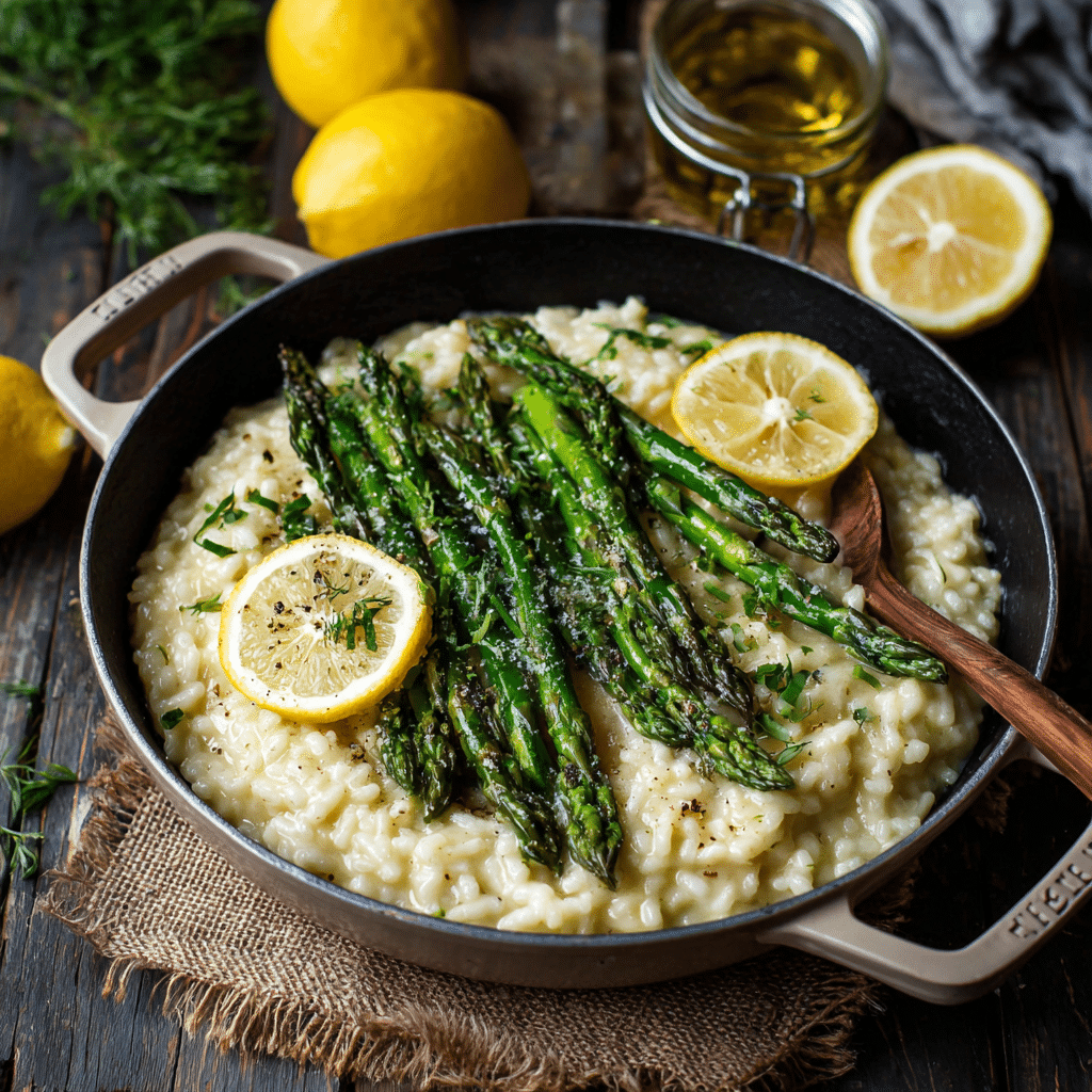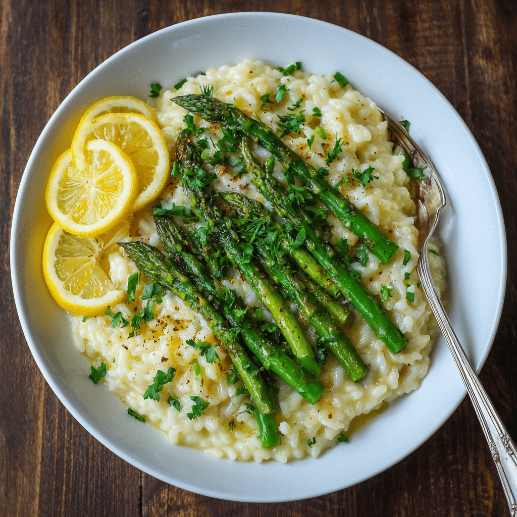 Spring Lemon Asparagus Risotto is a creamy, comforting rice dish filled with bright spring flavors. Arborio rice slowly cooks in warm broth while releasing starch that creates a silky texture. Fresh asparagus adds color and sweetness, while lemon zest and juice bring freshness and balance. Parmesan cheese and butter make the risotto rich and satisfying without feeling heavy. This recipe requires patience but uses simple ingredients and easy techniques. Serve it as a light dinner, elegant lunch, or side dish with grilled chicken or seafood. Each bite feels fresh, creamy, and full of spring flavor.