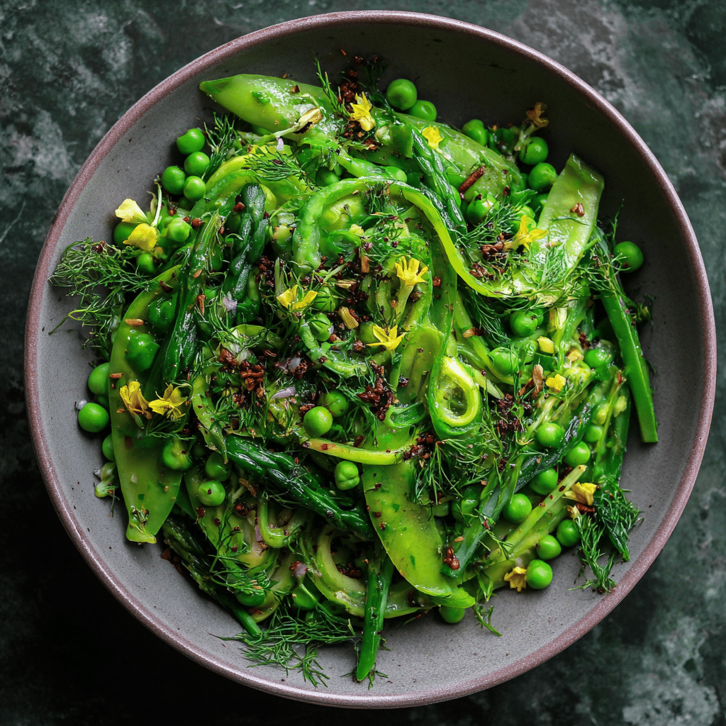 Spring always brings me back to one very specific memory. I remember walking with my grandmother through her small garden behind the house, where the air smelled like fresh herbs and warm earth. She would gently open the pea pods and hand them to me, and I would eat them right there, sweet and crisp, without even thinking. Thatโs where my love for Spring Pea Salad began.