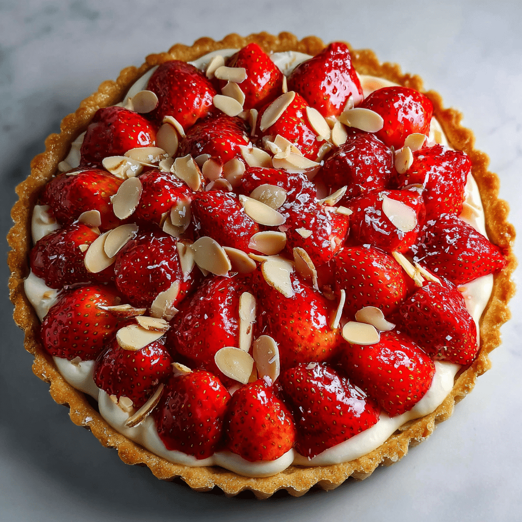 Strawberry Tart with Almond Cream combines a buttery crust, soft almond filling, and fresh strawberries glazed with apricot jam. I prepare a simple tart dough, fill it with creamy almond frangipane, bake until golden, and top with fresh strawberries. This elegant dessert balances crisp texture with nutty richness and sweet fruit. It works perfectly for spring gatherings, afternoon coffee, or special family meals. Store refrigerated for up to three days and serve slightly chilled or at room temperature.