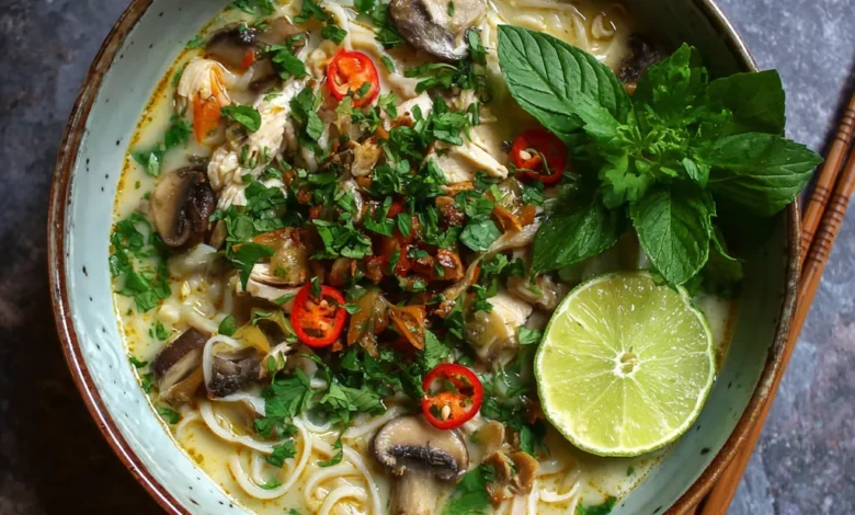 Ladle the soup into bowls. If you love spice, sprinkle extra chili or red pepper flakes. The combination of creamy coconut broth, lime, herbs, and tender noodles is pure comfort.