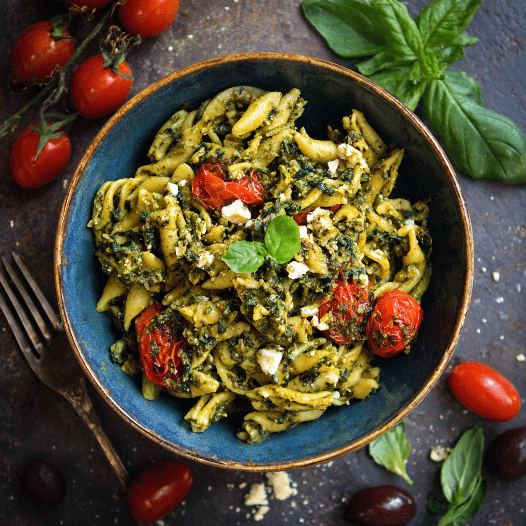 I love Vegetarian Pesto Pasta because it feels alive. The bright green basil, the golden olive oil, the creamy cheese — everything shines.