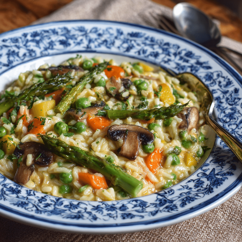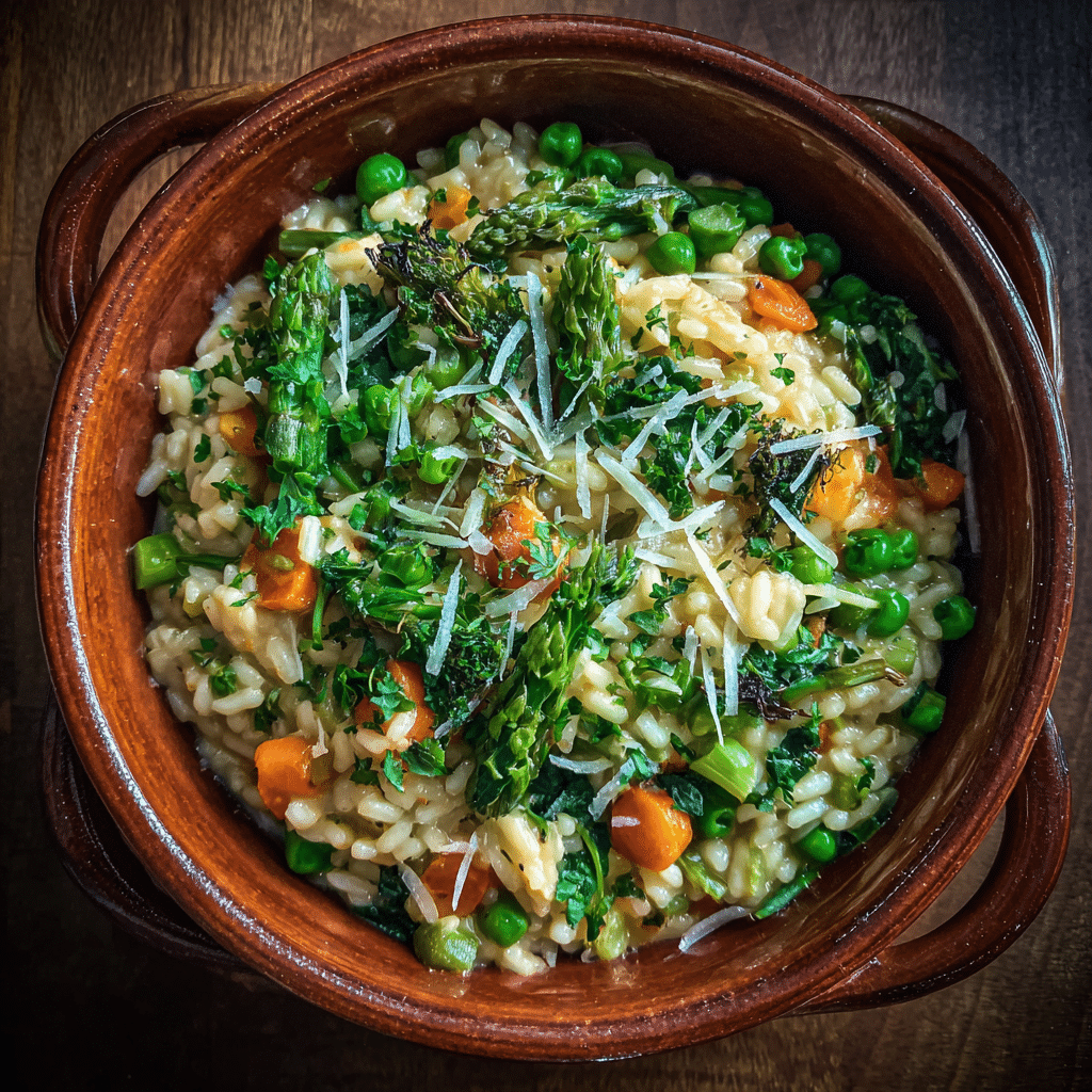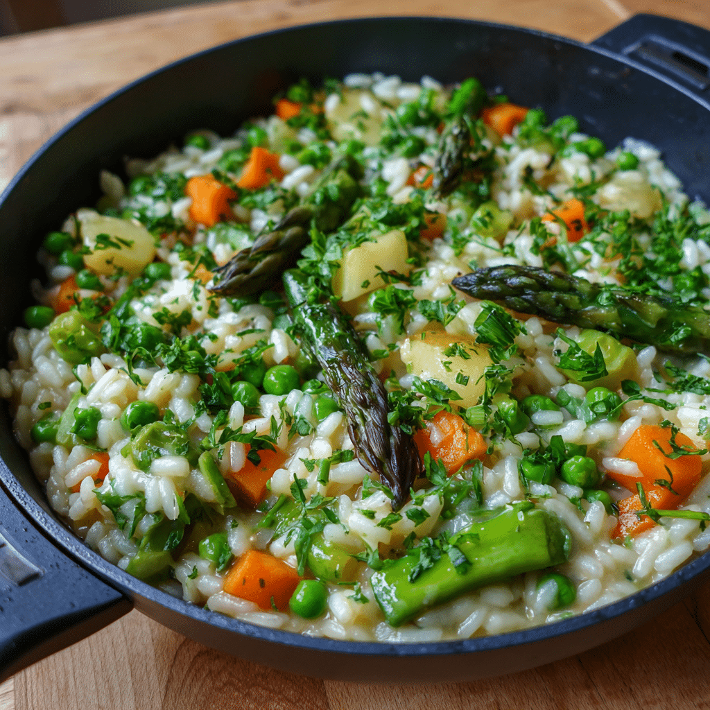 This vegetarian spring vegetable risotto features creamy Arborio rice slowly cooked with fresh zucchini, asparagus, peas, and finished with Parmesan and lemon zest. A comforting yet light seasonal dinner perfect for spring evenings.
