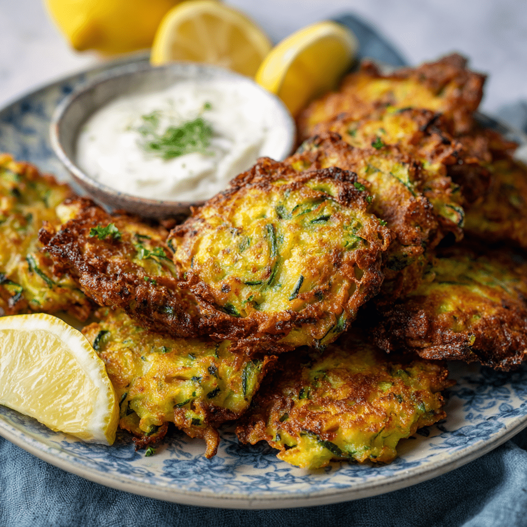 Zucchini Fritters are crispy Mediterranean patties made with grated zucchini, feta cheese, fresh herbs, eggs, and flour. Golden on the outside and soft inside, they are perfect as an appetizer or light meal.