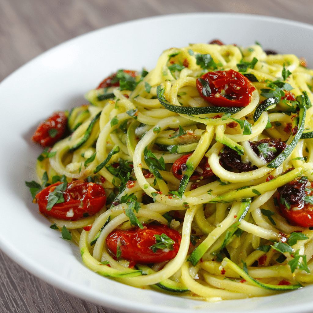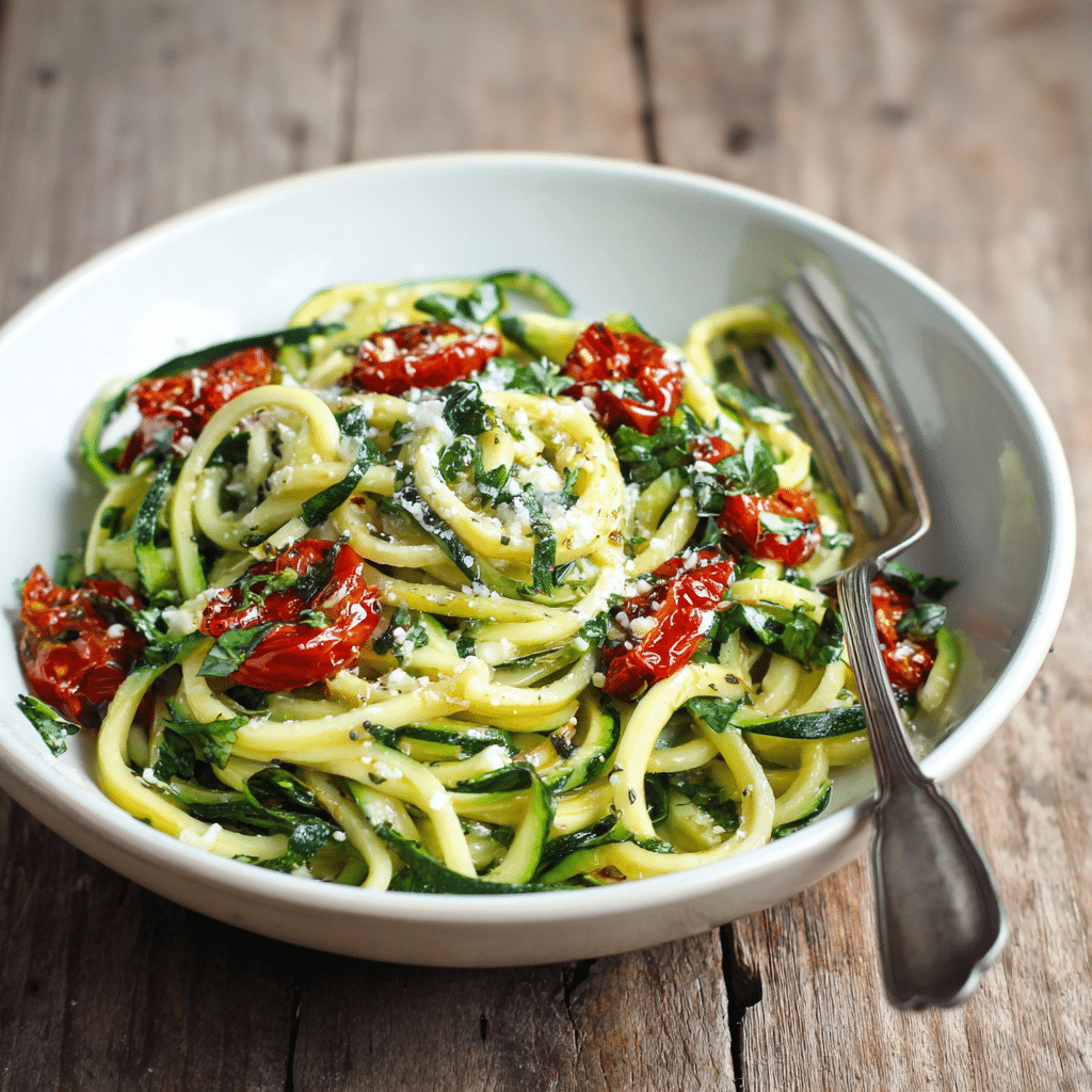 Zucchini Pasta (Zoodles) is a light and healthy alternative to traditional pasta. Fresh zucchini is spiralized into noodles and sautéed with olive oil, garlic, cherry tomatoes, lemon juice, and basil. This quick Mediterranean dish comes together in under 20 minutes and delivers bright, fresh flavor in every bite. Perfect as a low-carb lunch, simple dinner, or side dish, it feels satisfying without heaviness. Serve immediately for best texture and top with Parmesan, vegan cheese, or toasted pine nuts for extra flavor and crunch.