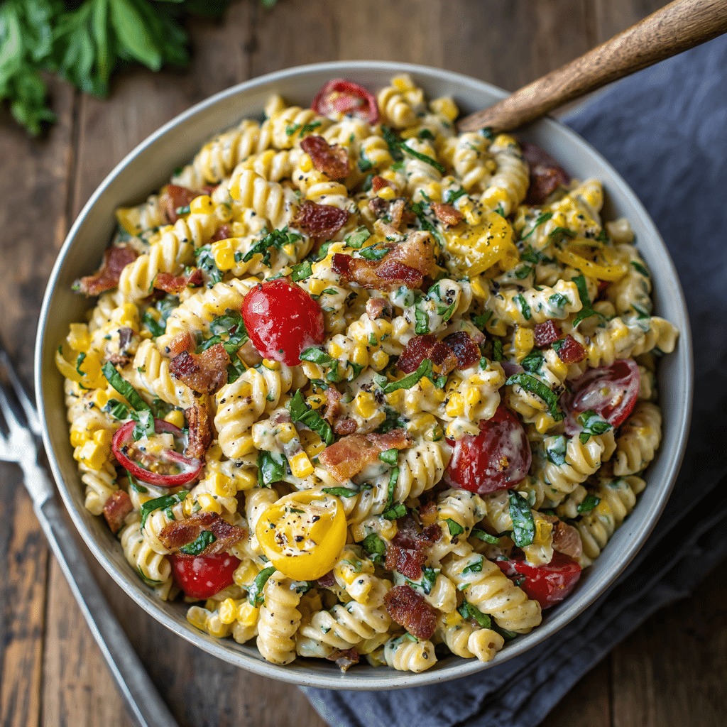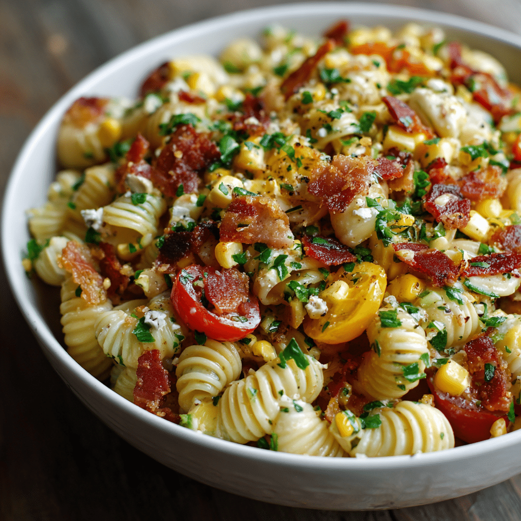 This Bacon Street Corn Pasta Salad combines creamy dressing, crispy bacon, and smoky charred corn into a comforting and crowd-pleasing dish perfect for summer gatherings.