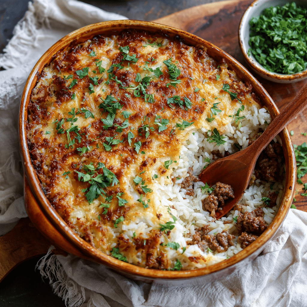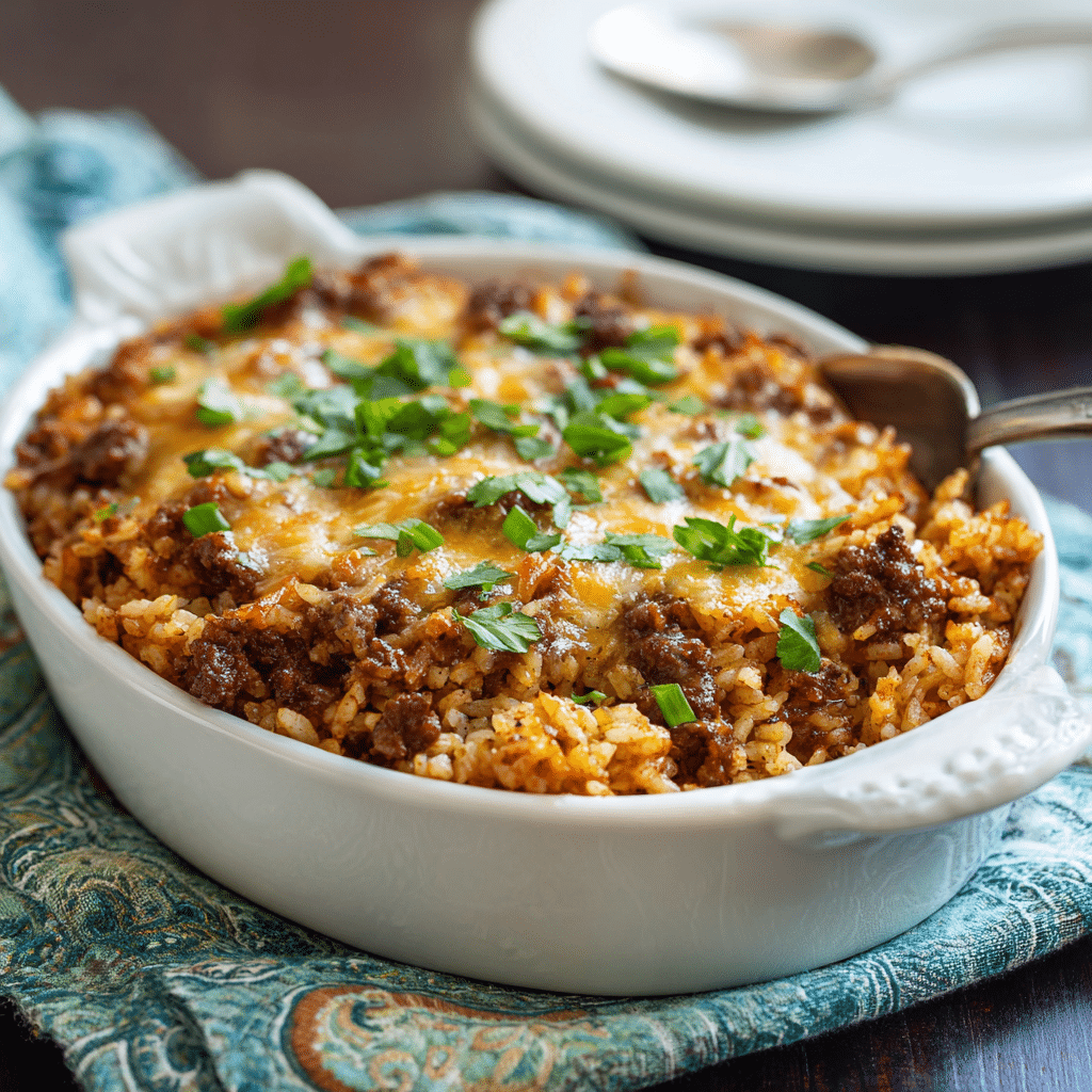 A cozy, oven-baked beef and rice casserole made with simple pantry ingredients, slow-baked until tender and comforting. This hearty dish brings deep flavor, warmth, and family-style comfort to the table