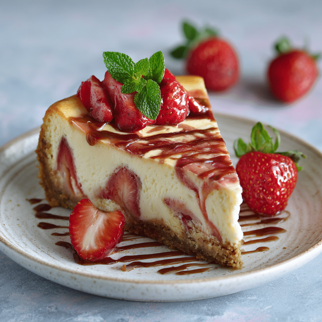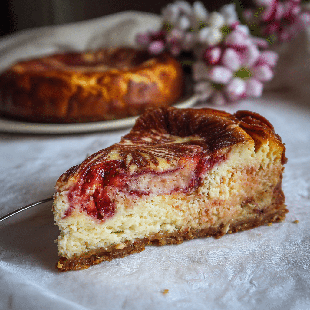 This baked strawberry swirl cheesecake combines a buttery biscuit crust, rich and creamy vanilla cheesecake filling, and a homemade strawberry sauce swirled beautifully on top. Perfect for celebrations or family gatherings, this classic baked cheesecake delivers a smooth texture and balanced sweetness in every bite.