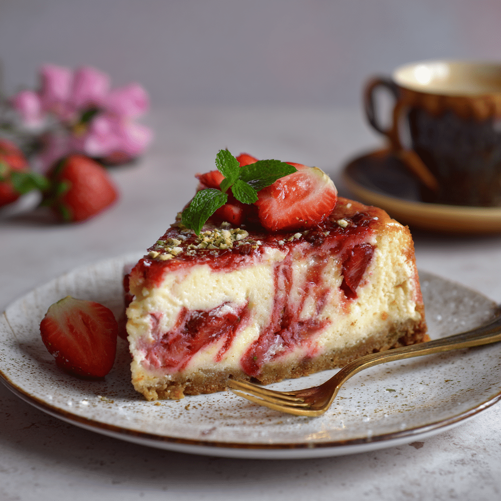 I love this cheesecake because it feels elegant but comforting at the same time. The creamy filling melts in your mouth, while the strawberry swirl adds a fruity brightness that balances the richness.