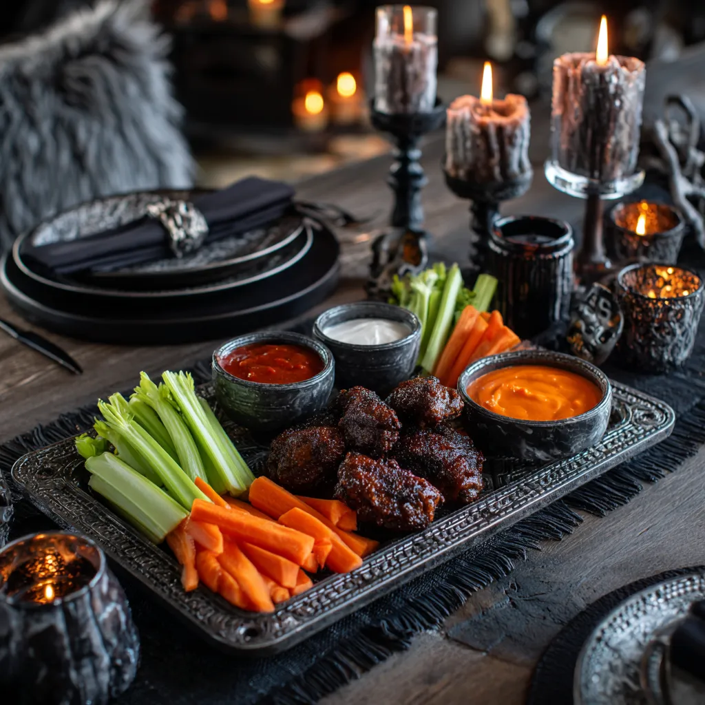 Arrange the bat-wing buffalo chicken drumettes on a platter with celery, carrots, and a bowl of ranch or blue cheese dressing. Sprinkle chopped parsley for a pop of green. Add some Halloween decorations around the platter for extra fun.