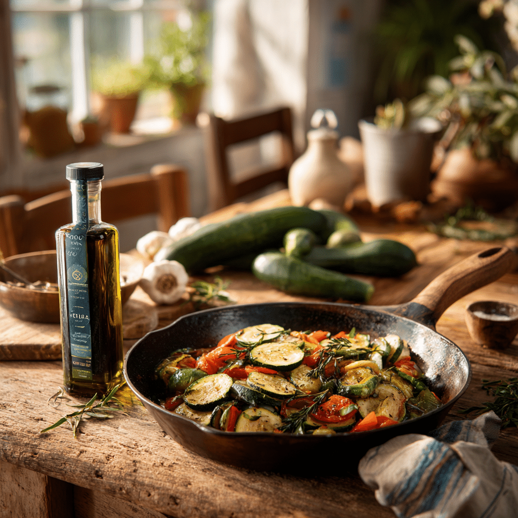 - I start with a pan and warm olive oil gently. I never rush this step.