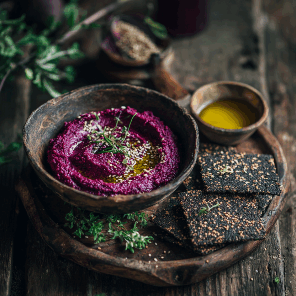 Hi, I’m Inaya from Crete, and today I want to share a recipe that’s both bold and beautiful: Bloody Beet Hummus with Black Crackers. This dish takes me back to evenings when my grandmother would roast beets in the clay oven. She always said beets were “the jewels of the earth,” with their deep ruby color and natural sweetness.