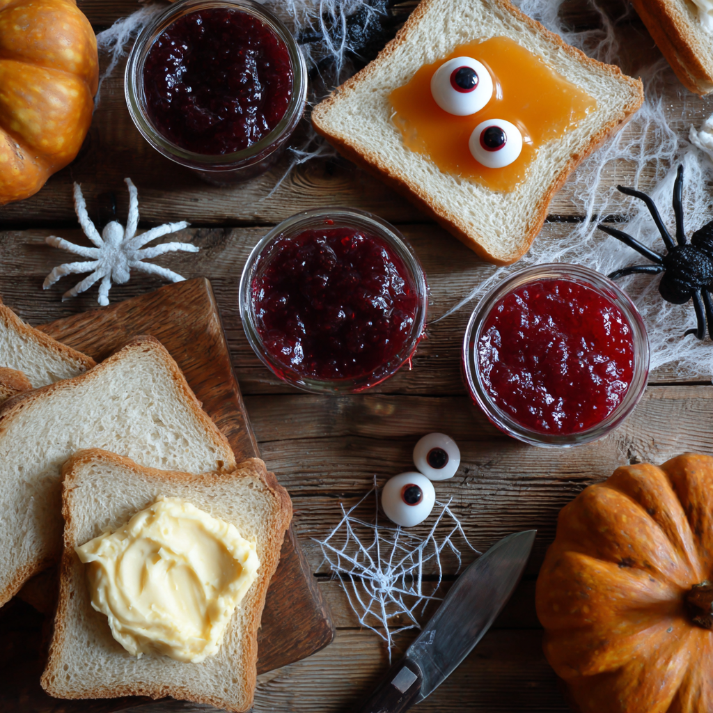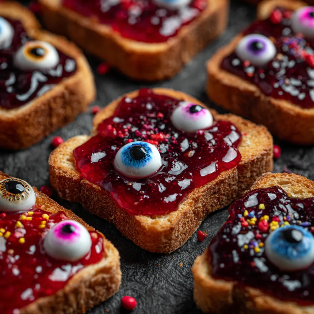 Place candy eyeballs on top of the jam. You can add just two for a “monster look” or cover the toast with many for a “haunted swarm.” The contrast between the white eyeballs and the red jam makes it pop.