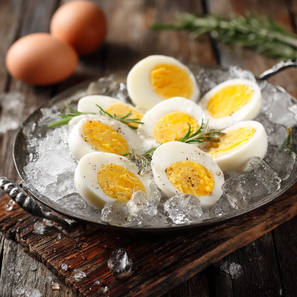 Place your eggs in a saucepan and cover them with cold water. Bring to a gentle boil, then cook for 10–11 minutes. Once done, transfer immediately into ice water to stop the cooking. Peel carefully.